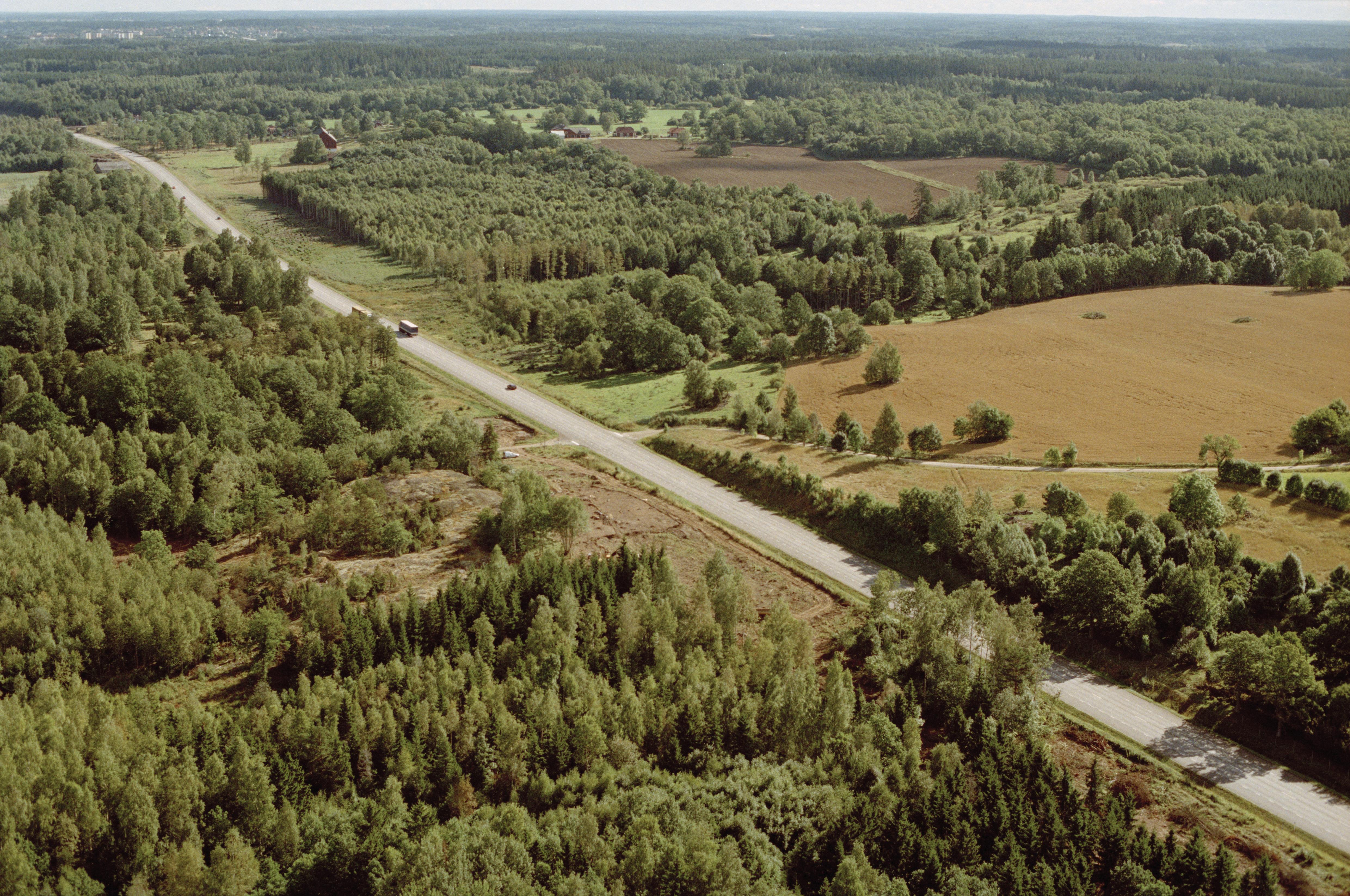 Beskrivning: Arkeologisk undersökning innan bygging av väg E4 i området Mörby, Jordsfälle, Stora och Lilla Ljuna. Fossil åker RAÄnr Hogstad 167:1, 171:1 m.fl vid bildens mitt. Bilden är tagen mot (väderstreck): Ö