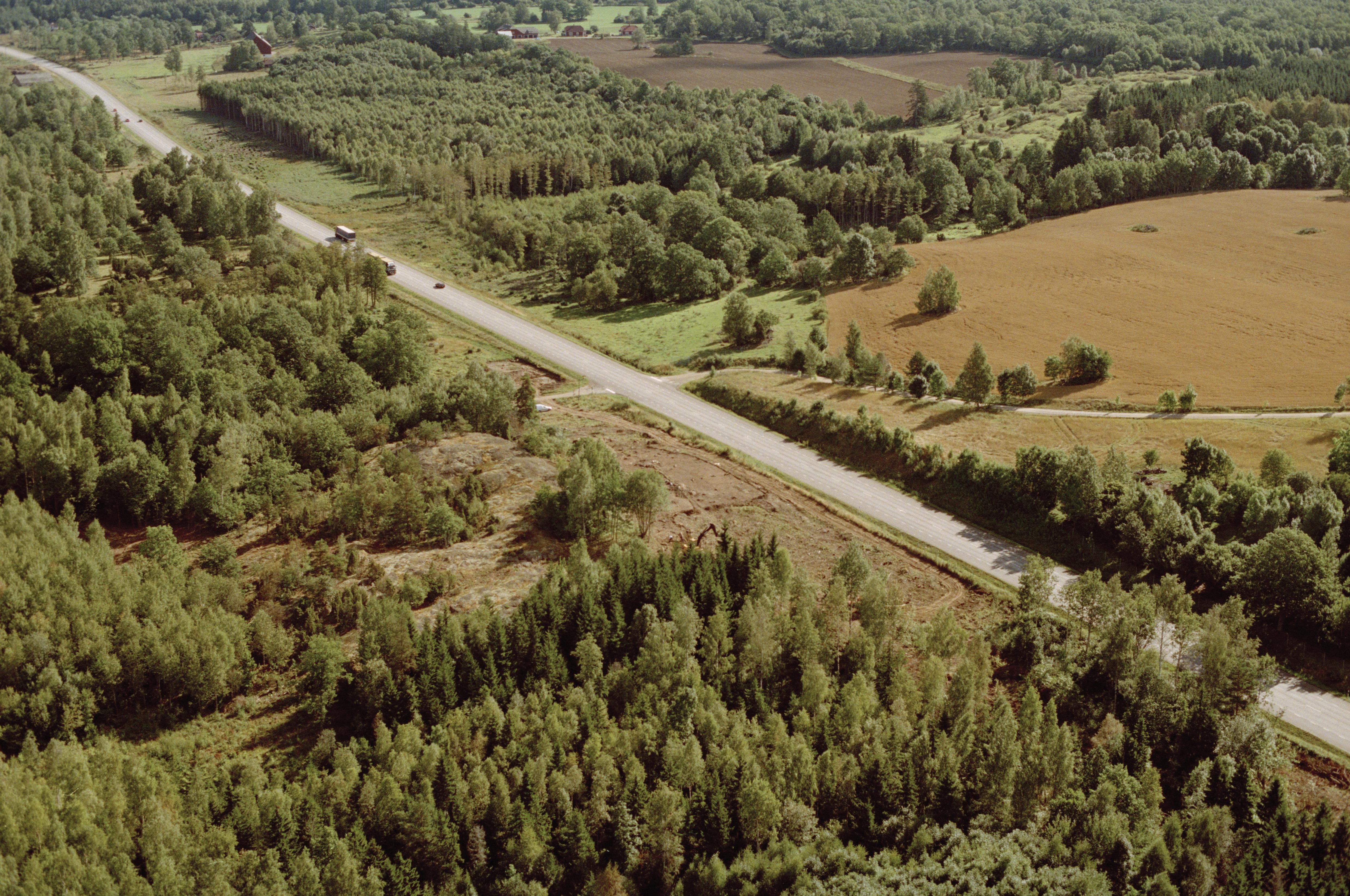 Beskrivning: Arkeologisk undersökning innan bygging av väg E4 i området Mörby, Jordsfälle, Stora och Lilla Ljuna. Fossil åker RAÄnr Hogstad 167:1, 171:1 m.fl vid bildens mitt. Bilden är tagen mot (väderstreck): OSO