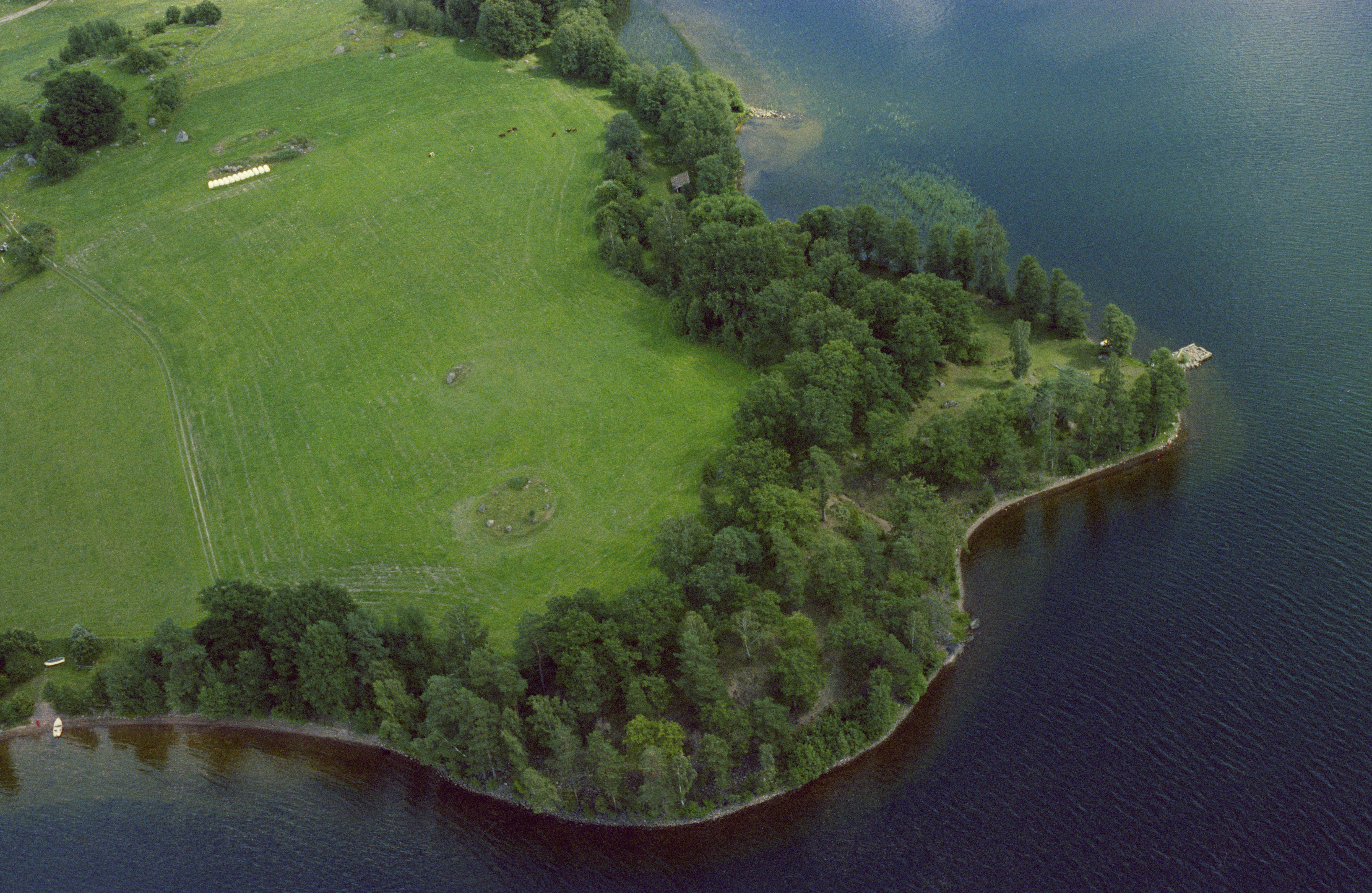 Beskrivning: Jätteudden vid sjön Åsunden. Gravfält med skeppssättning, och domarring RAÄnr Horn 15:1. Bilden är tagen mot (väderstreck): OSO