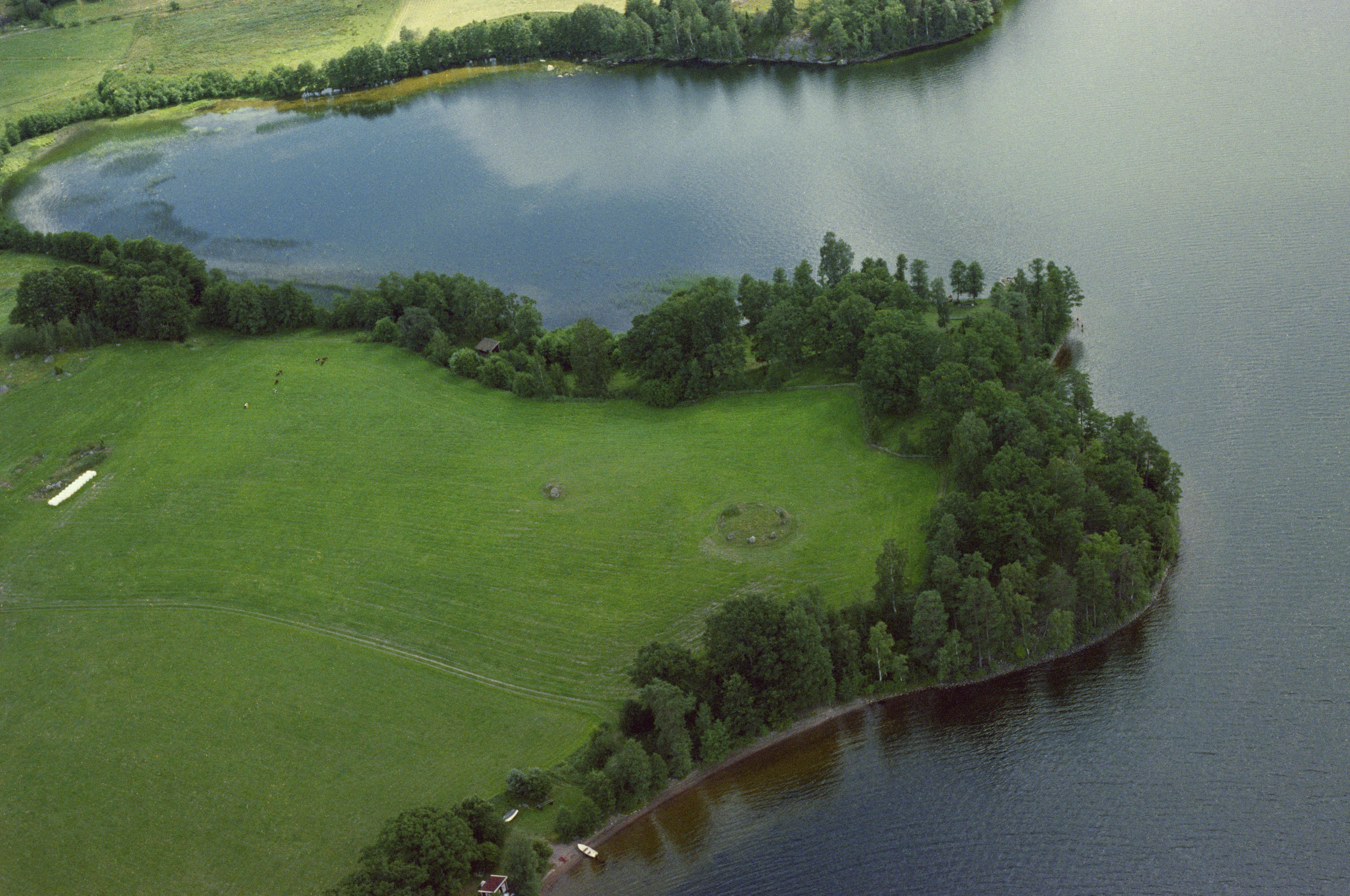 Beskrivning: Jätteudden vid sjön Åsunden. Gravfält med skeppssättning, och domarring RAÄnr Horn 15:1. Bilden är tagen mot (väderstreck): SSO