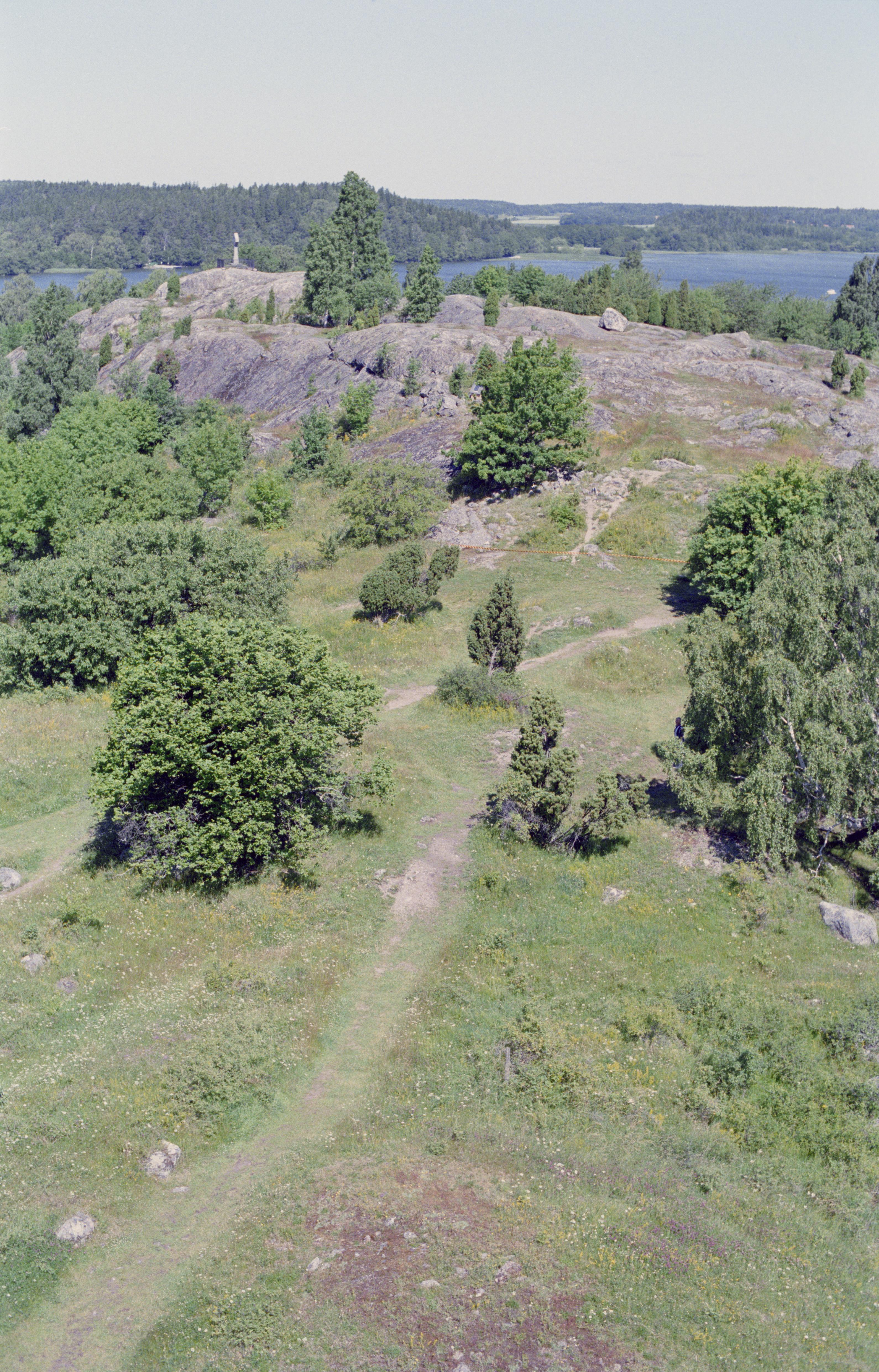 Beskrivning: Fornlämningsområdet Birka på Björkö i Mälaren. Stigar i gravältet Borgs hage RAÄnr Adelsö 35:1. I bildens övre del Ansgarsmonumentet i fornborg Borg RAÄnr Adelsö 34:1. Bilden är tagen mot (väderstreck): N