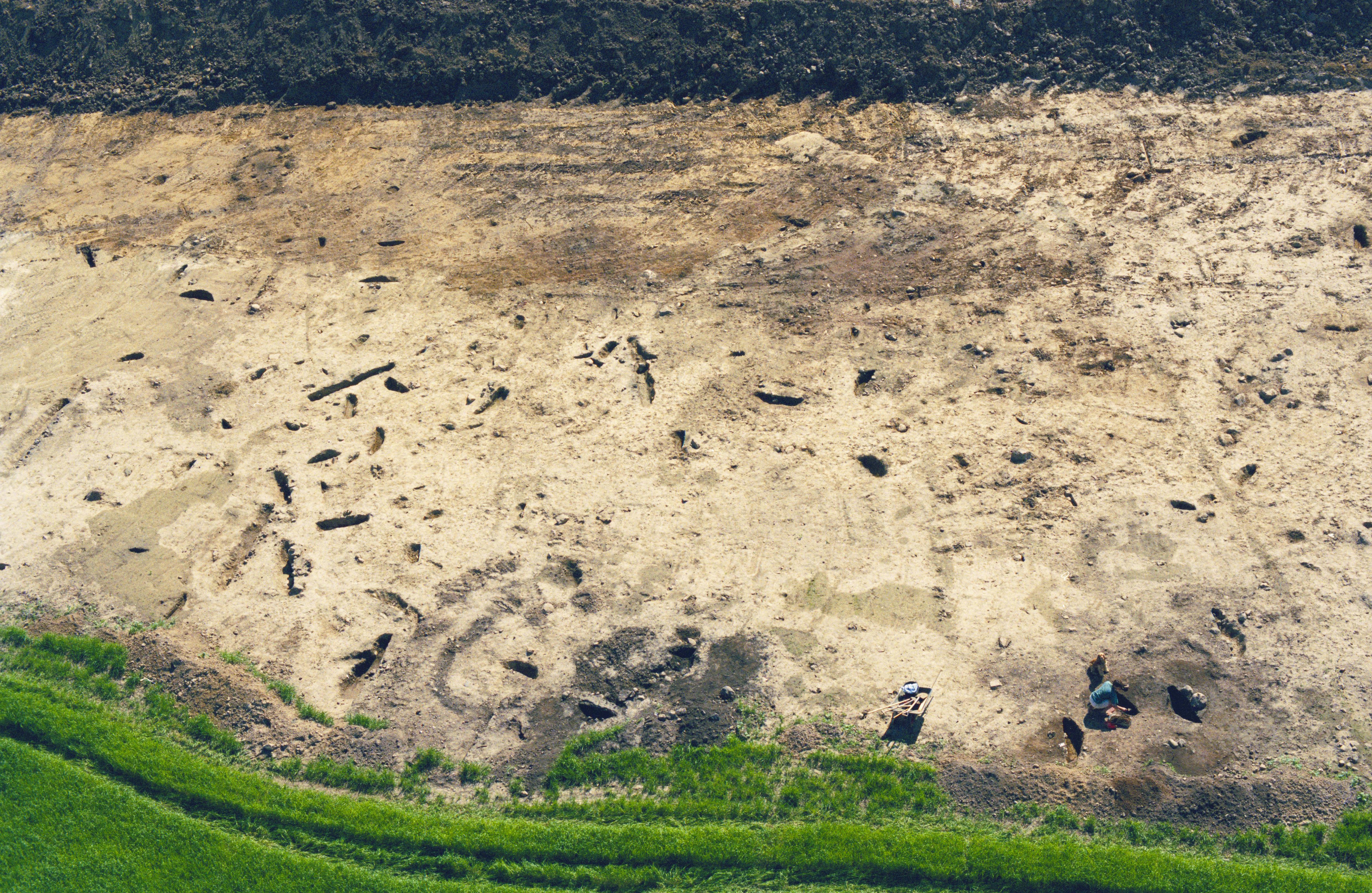 Beskrivning: Arkeologisk undersökning vid gränsen mellan socknen Högby och Mjölby innan bygging av ny väg. Boplats RAÄnr Högby 89:1 m.fl. Bilden är tagen mot (väderstreck): SV