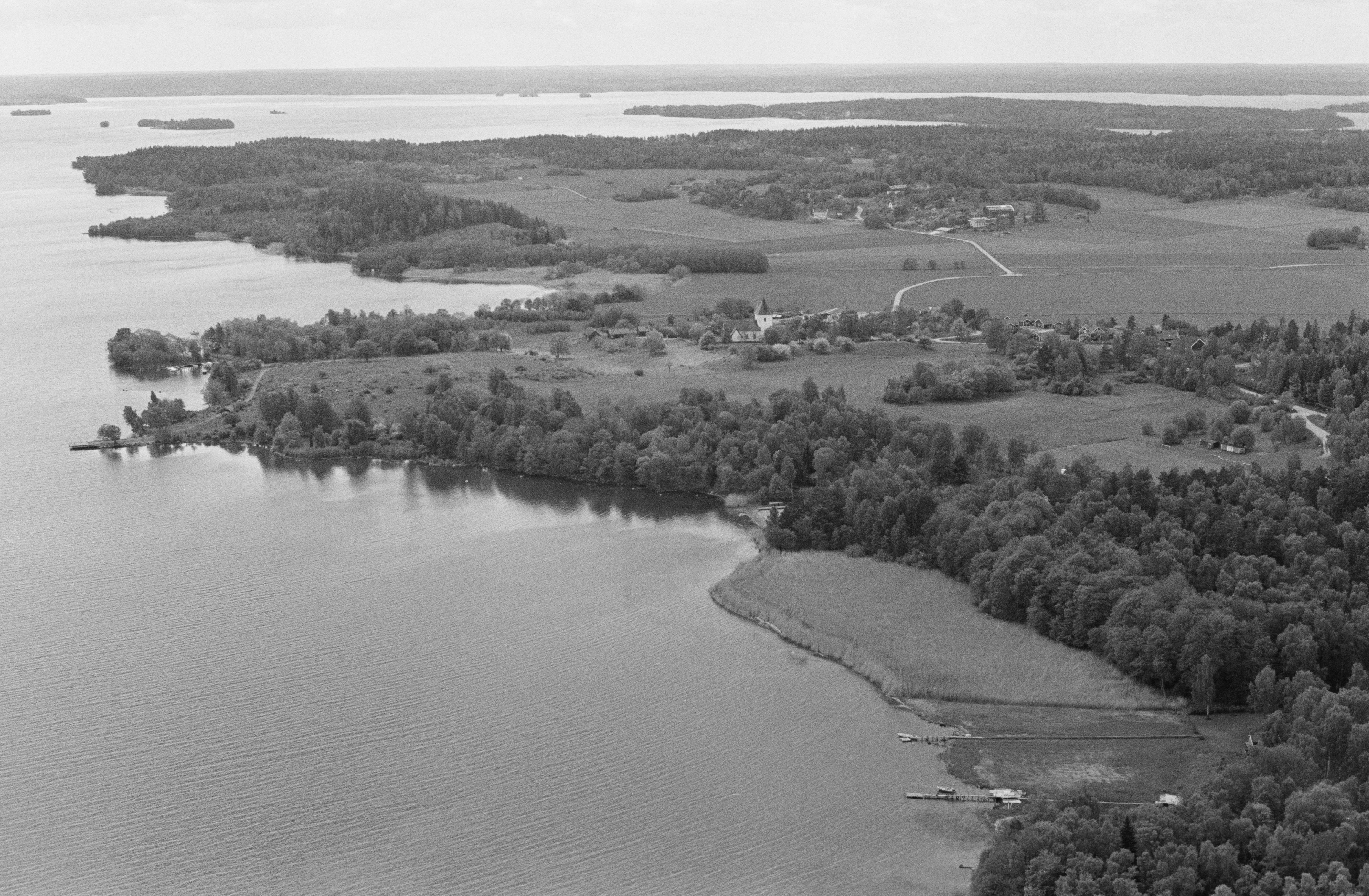 Beskrivning: Fornlämningsområdet Hovgården RAÄnr Adelsö 46:2 på Adelsön vid Hovgårdsfjärden i Mälaren. Alsnö hus RAÄnr Adelsö 47:1, Adelsö kyrka, Kungshögarna Adelsö 48:1-6 m.fl. Bilden är tagen mot (väderstreck): SSV