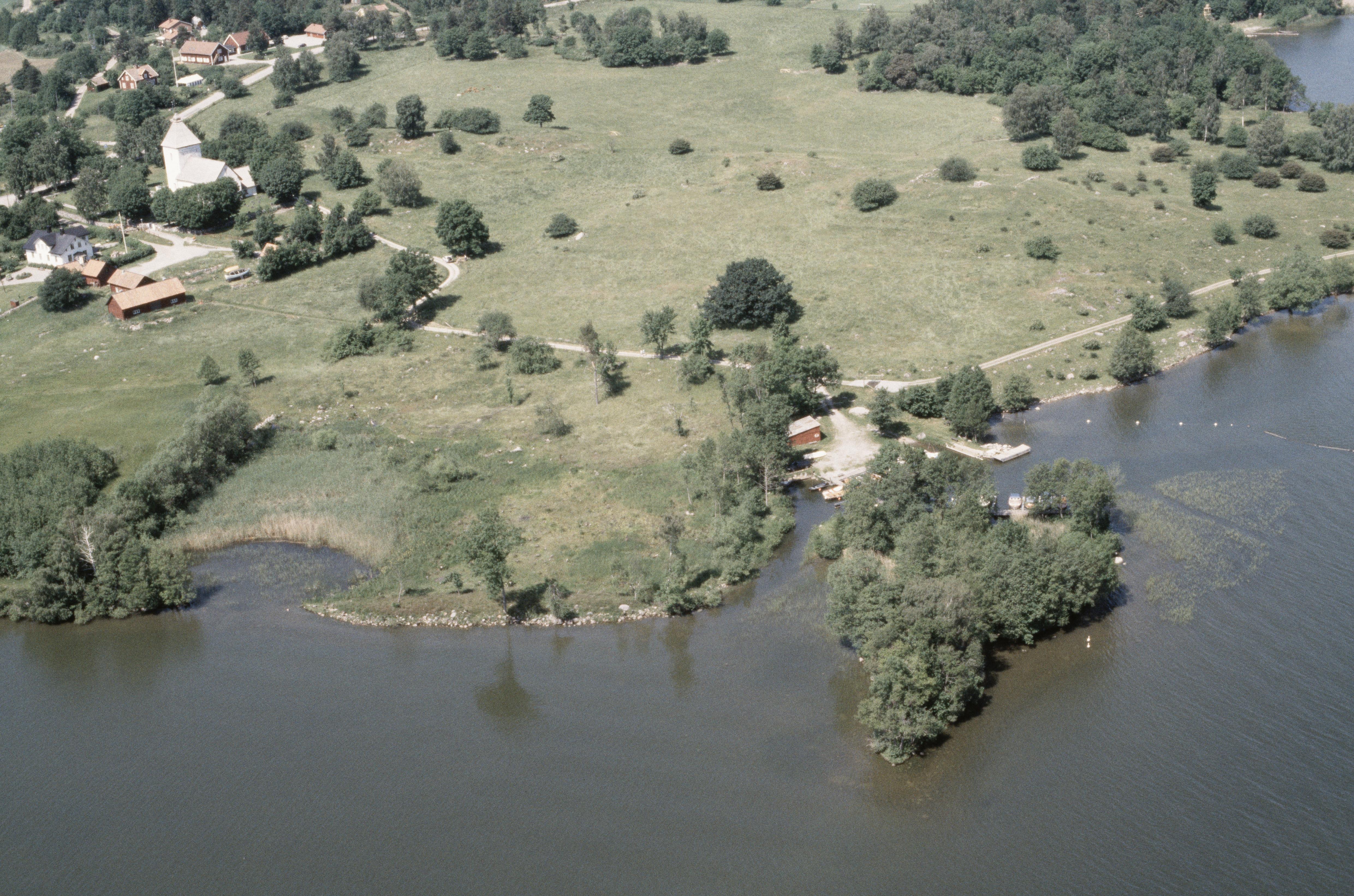 Beskrivning: Fornlämningsområdet Hovgården RAÄnr Adelsö 46:2 på Adelsön vid Hovgårdsfjärden i Mälaren. Adelsö kyrka, Alsnö hus RAÄnr Adelsö 47:1. Gamla hamnen med spärranordning RAÄnr Adelsö 143:1 m.fl. Bilden är tagen mot (väderstreck): NV