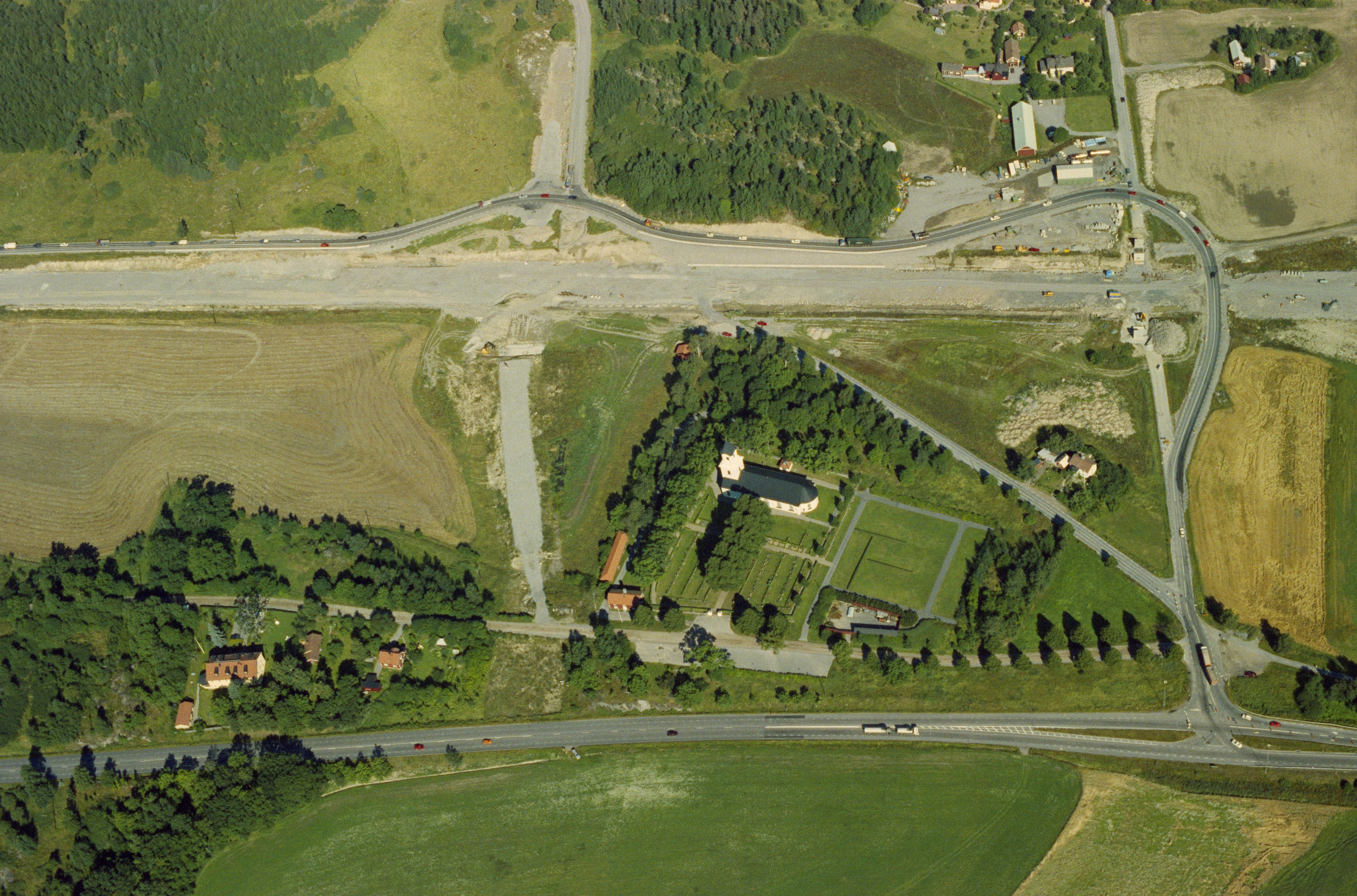 Beskrivning: Bygge av väg E4 vid Borgs kyrka och Herrebro (i tid. Borgs socken). Bilden är tagen mot (väderstreck): NNV