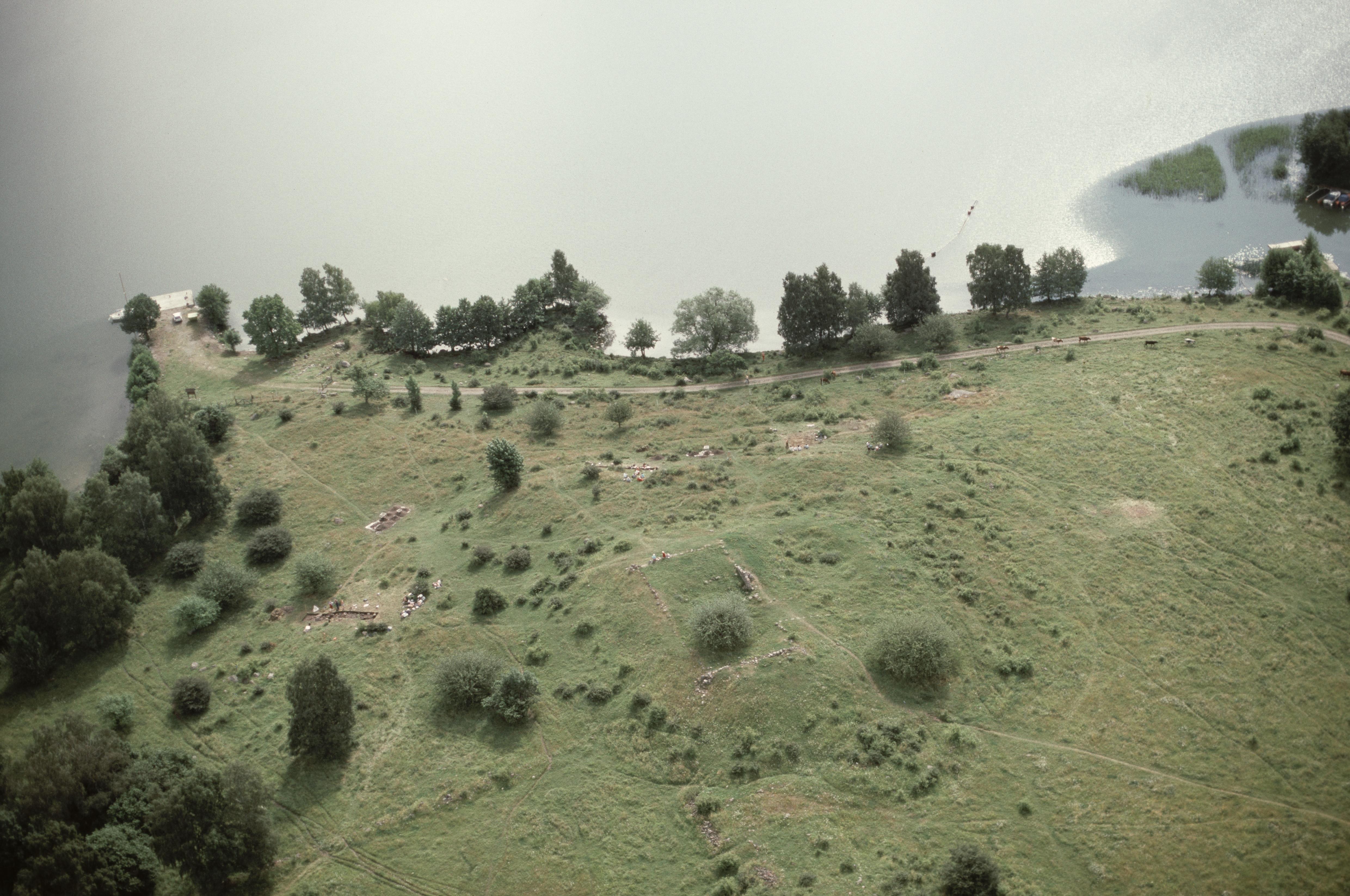 Beskrivning: Fornlämningsområdet Hovgården RAÄnr Adelsö 46:2 på Adelsön vid Hovgårdsfjärden i Mälaren. Arkeologisk undersökning i Alsnö hus RAÄnr Adelsö 47:1, stensättningar Adelsö 236 och 237 m.fl. Bilden är tagen mot (väderstreck): OSO