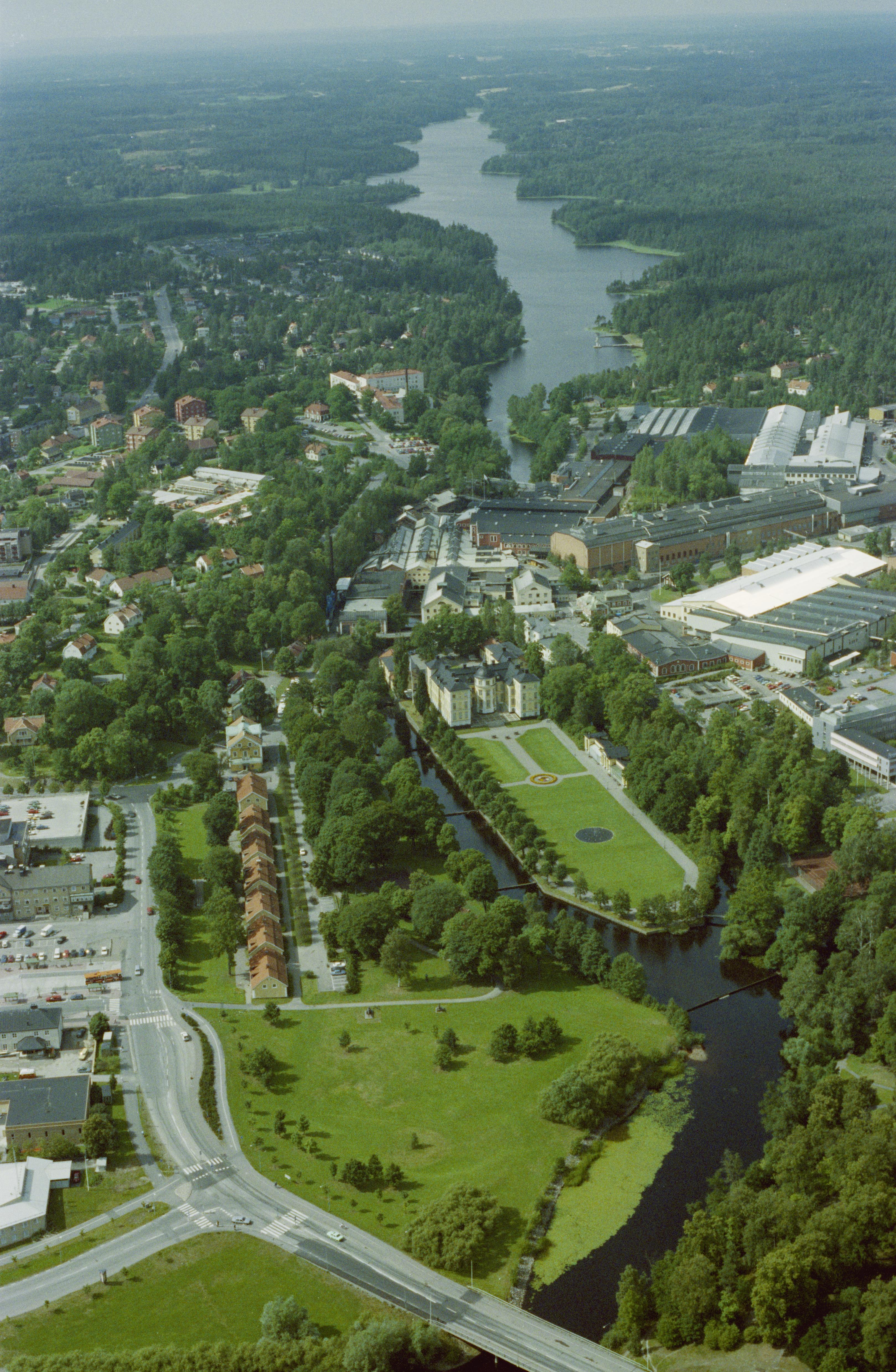 Beskrivning: Finspångs tätort. Finspångs slott RAÄnr Risinge 88:1 vid bildens mitt. I bildens övre del sjön Bönnern. Bilden är tagen mot (väderstreck): VNV
