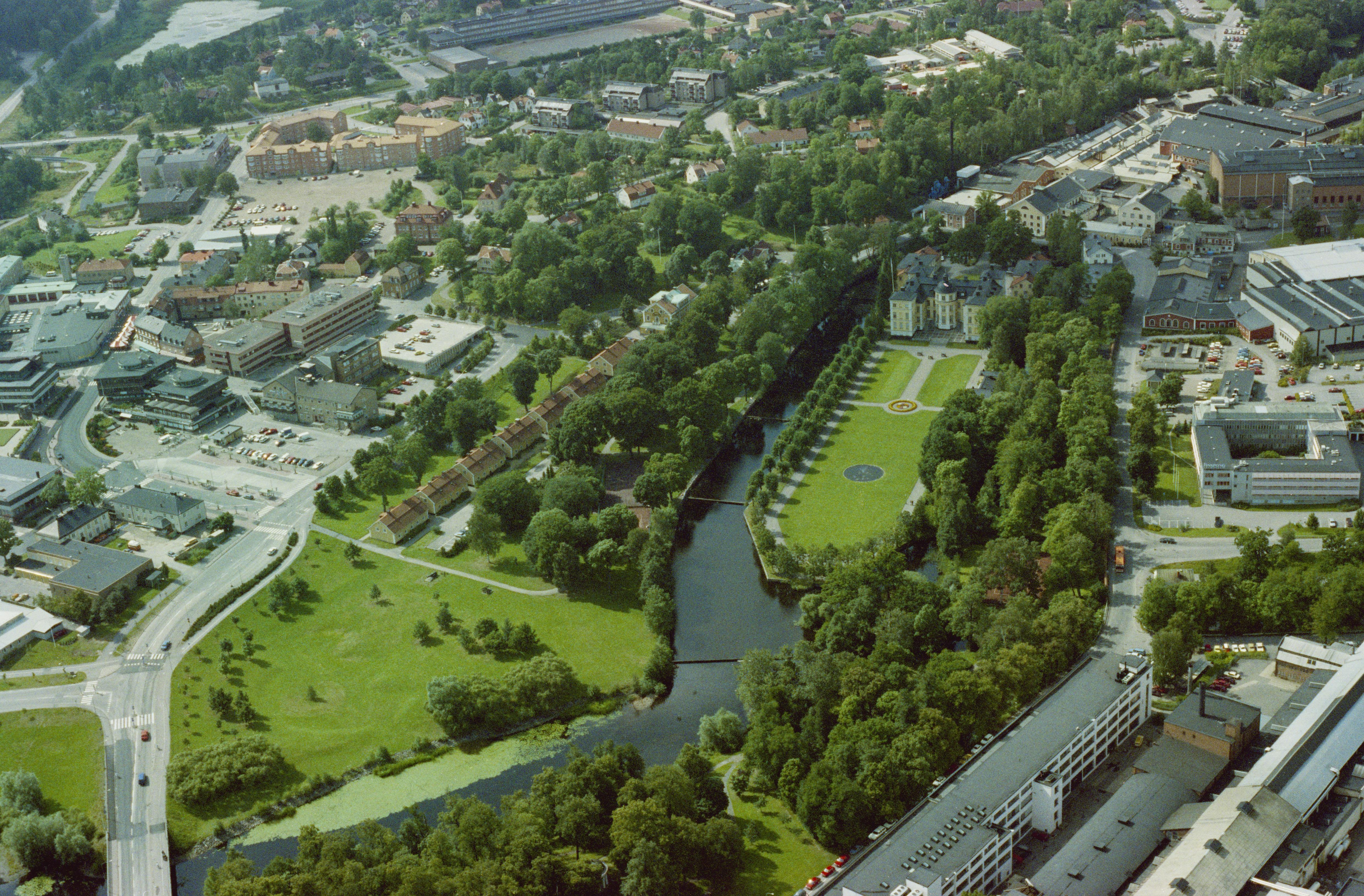 Beskrivning: Finspångs tätort. Finspångs slott RAÄnr Risinge 88:1 vid bildens mitt. Bilden är tagen mot (väderstreck): VSV