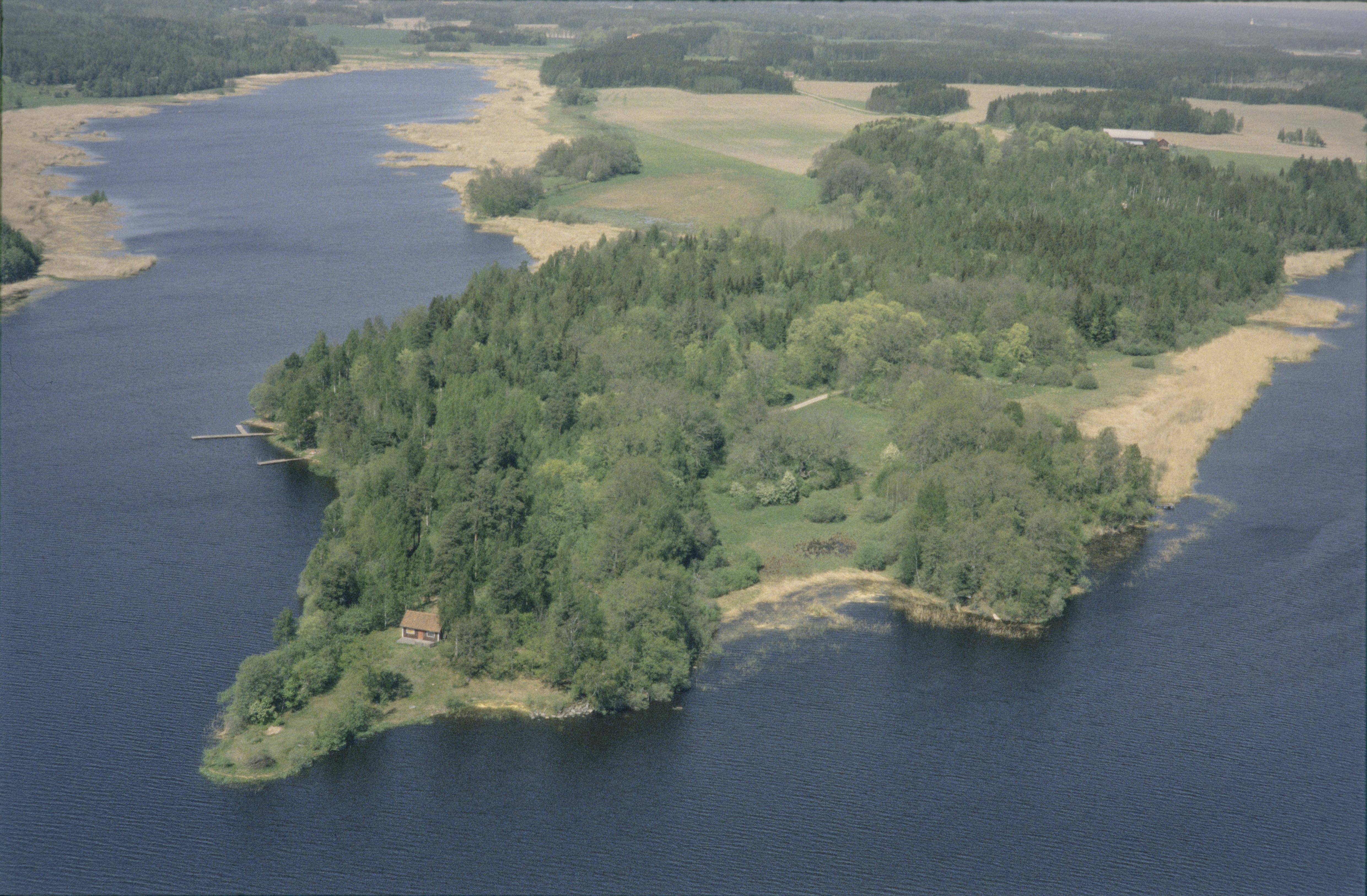 Beskrivning: Näsudden mellan Frötunaviken (till vänster) och Enbyleviken i Funbosjön. Frötunaviken markerar gränsen mot Funbo socken i bildens vänstra del. Nere till höger stenusruin efter medeltidsbyggnad RAÄnr Rasbo 599:1. Bilden är tagen mot (väderstreck): NNV
