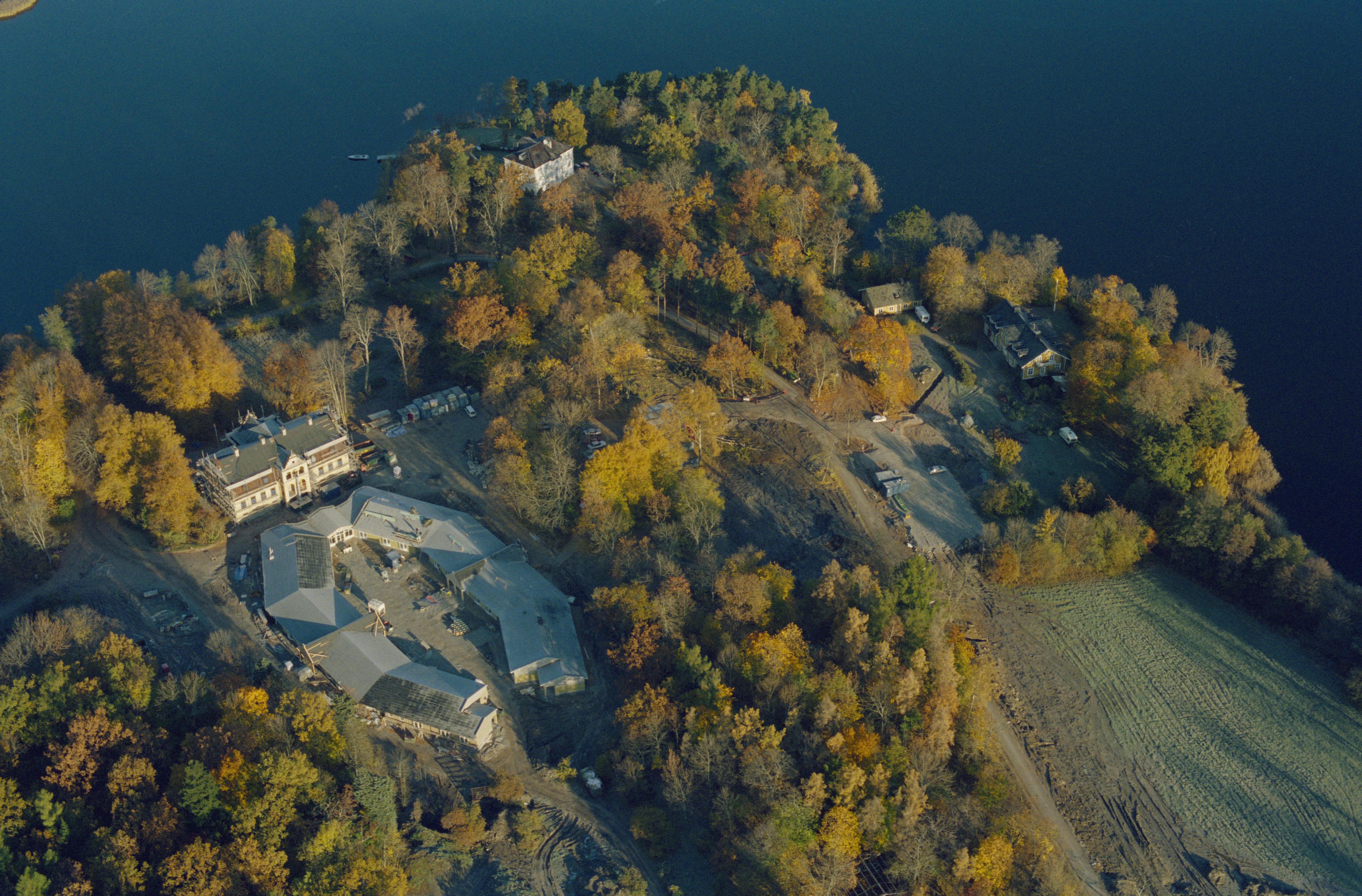 Beskrivning: Till vänster Farsta slott. I bildens övre del Villa Farsta Udde vid Farstavikens södra strand. Vid bildens mitt bytomt Farsta gårdstomt RAÄnr Gustavsberg 42:1. Bilden är tagen mot (väderstreck): N