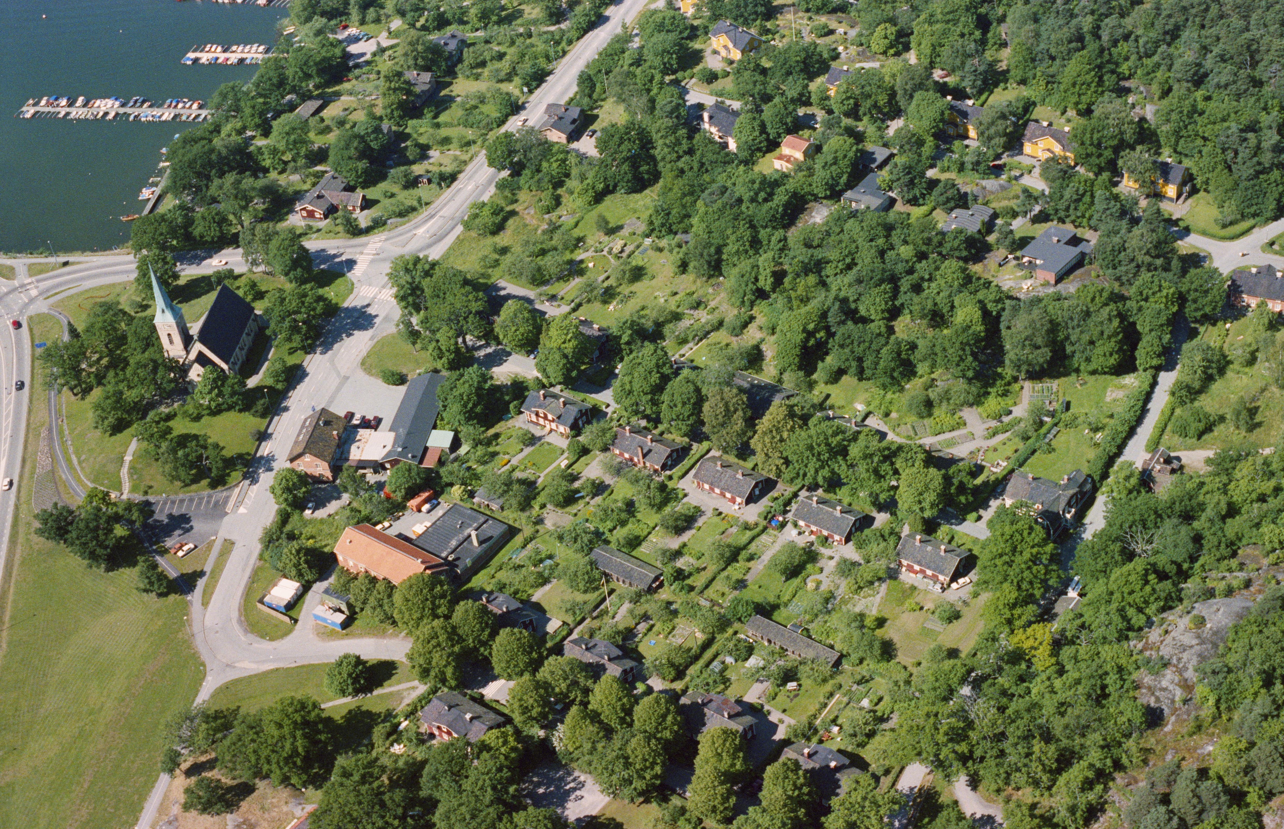 Beskrivning: Gustavsbergs tätort. Uppe till vänster Gustavsbergs kyrka vid Farstaviken. Vid bildens mitt arbetarbostäder för porslinsfabriken, Grindstugatan RAÄnr Gustavsberg 36:1 med byggnaden det Gamla Apoteket. Värmdögatan till vänster om bildens mitt. Bilden är tagen mot (väderstreck): VSV