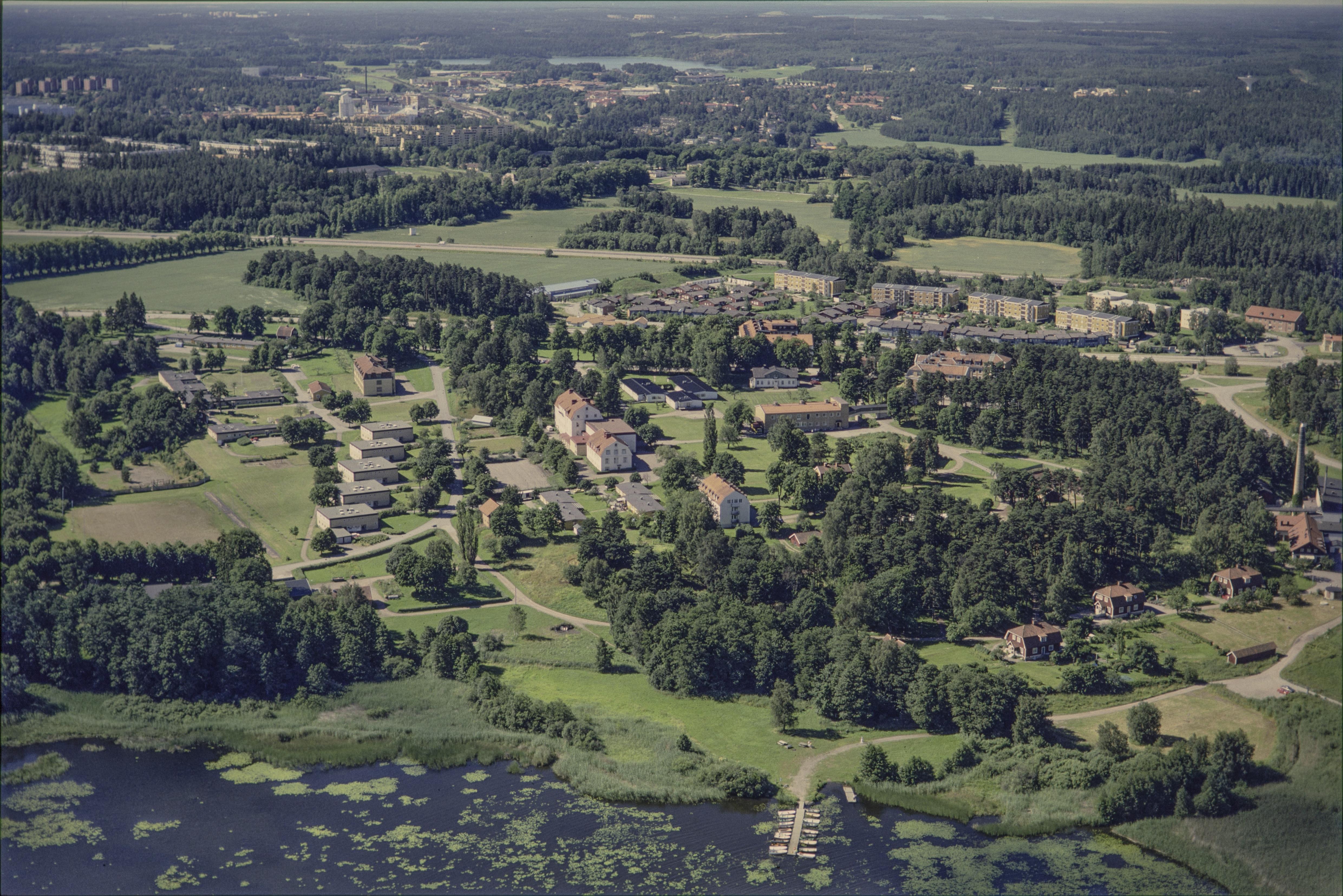 Beskrivning: Tätorten Hagängen vid sjön Fysingen. Sjukhuset Löwenströmska lasarettet. Vid bildens mitt området med de borttagna stensättningarna / högarna RAÄnr Hammarby 57:1. Bilden är tagen mot (väderstreck): SV