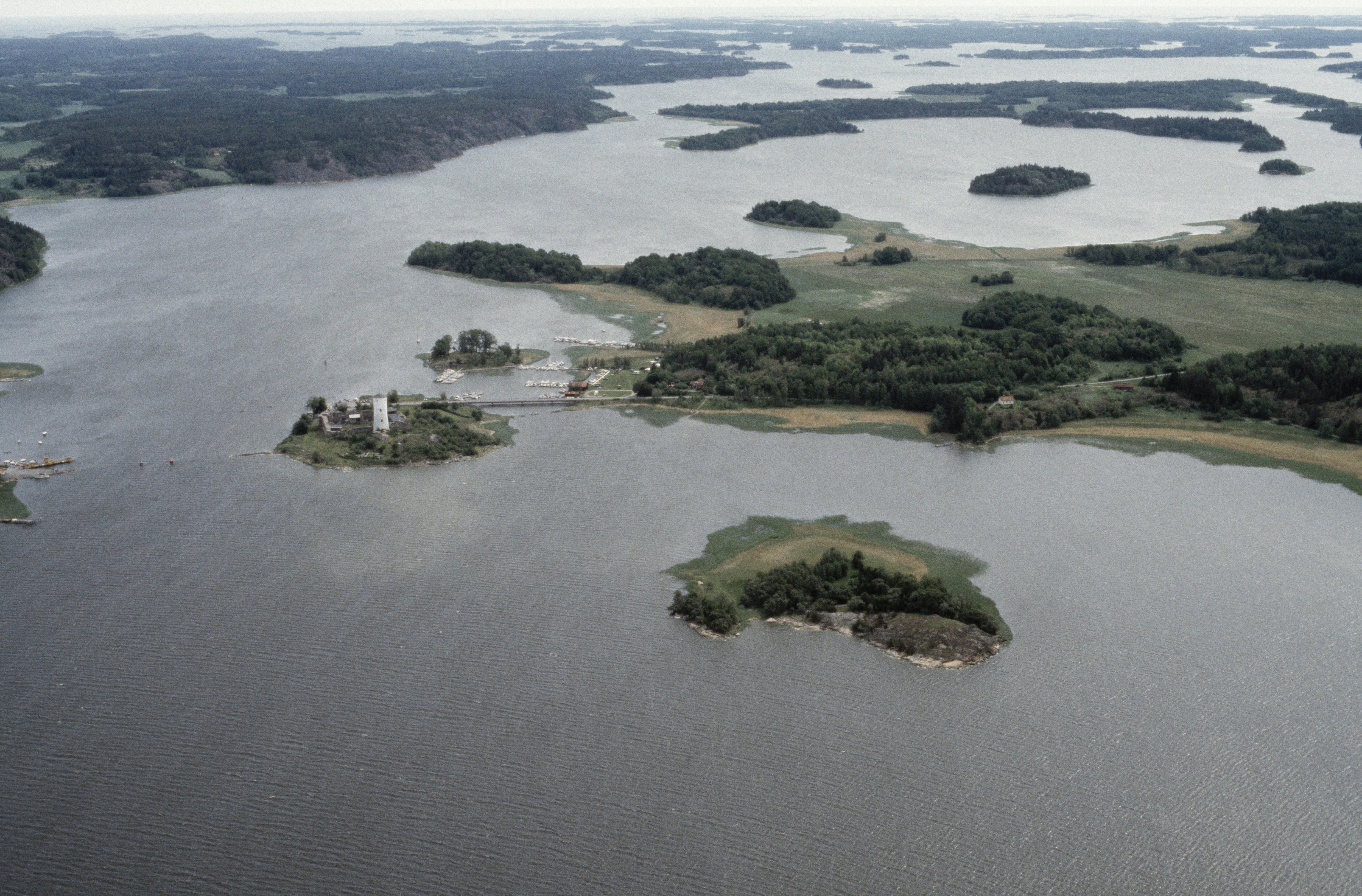 Beskrivning: Havsviken Slätbaken. Stegeborgs slottsruin RAÄnr Skällvik 222:1, Stegeborgs herrgård och Skällviks kyrka. Bilden är tagen mot (väderstreck): OSO