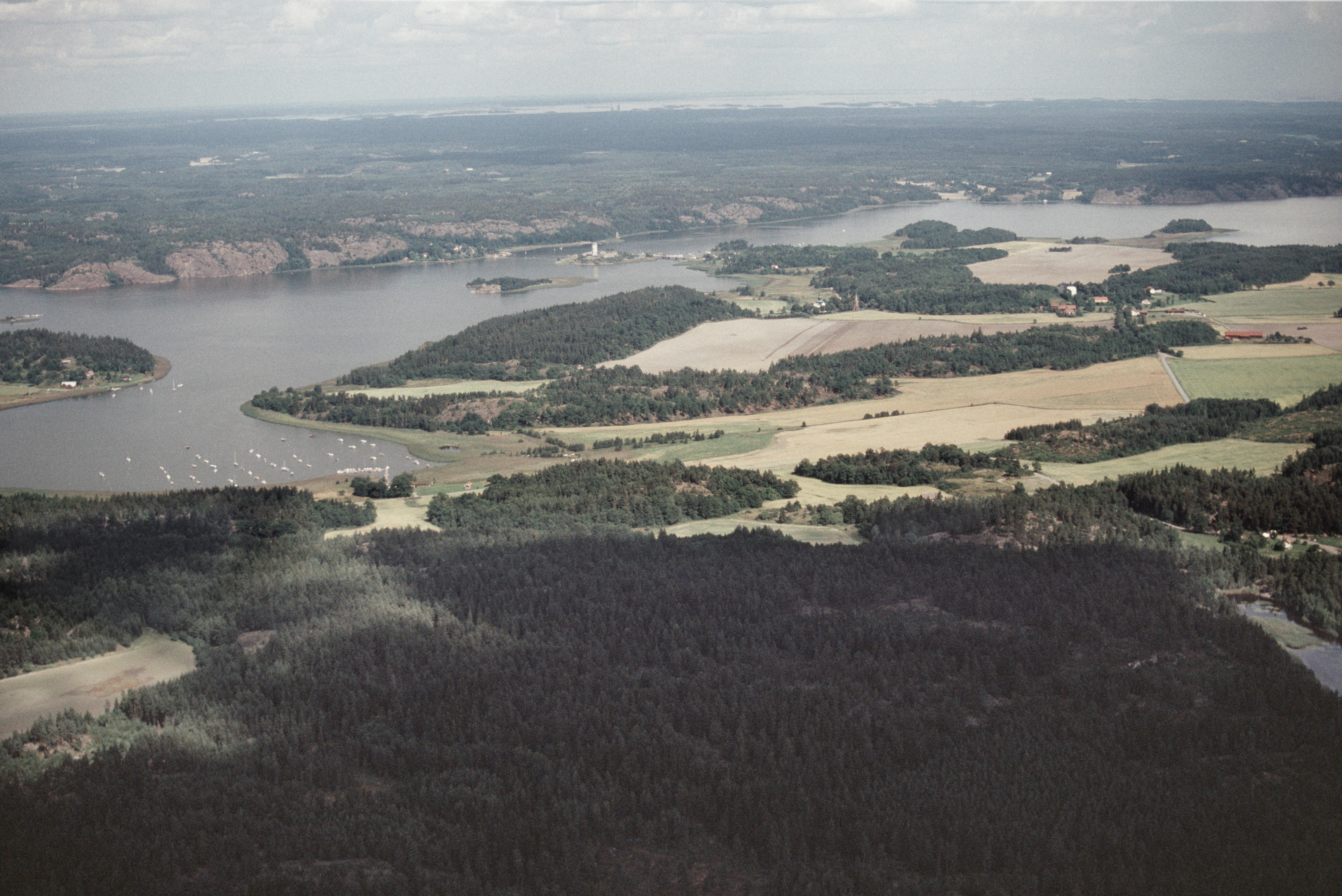Beskrivning: Havsviken Slätbaken. Skällviks kyrka, Stegeborgs herrgård. I bildens övre del Stegeborgs slottsruin Skällvik RAÄnr 222:1. Bilden är tagen mot (väderstreck): NO