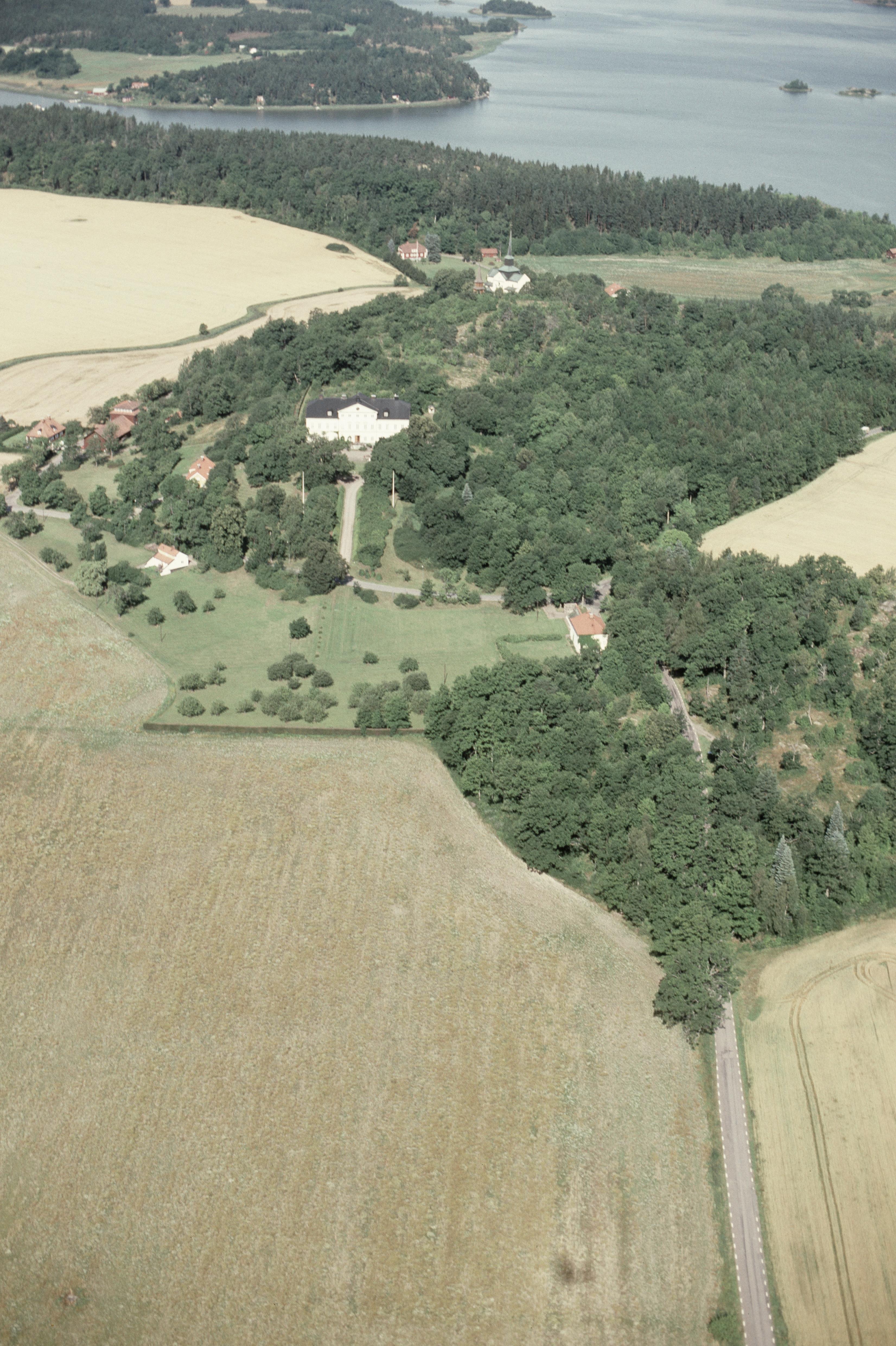 Beskrivning: Havsviken Slätbaken. Stegeborgs herrgård och Skällviks kyrka. Bilden är tagen mot (väderstreck): NV