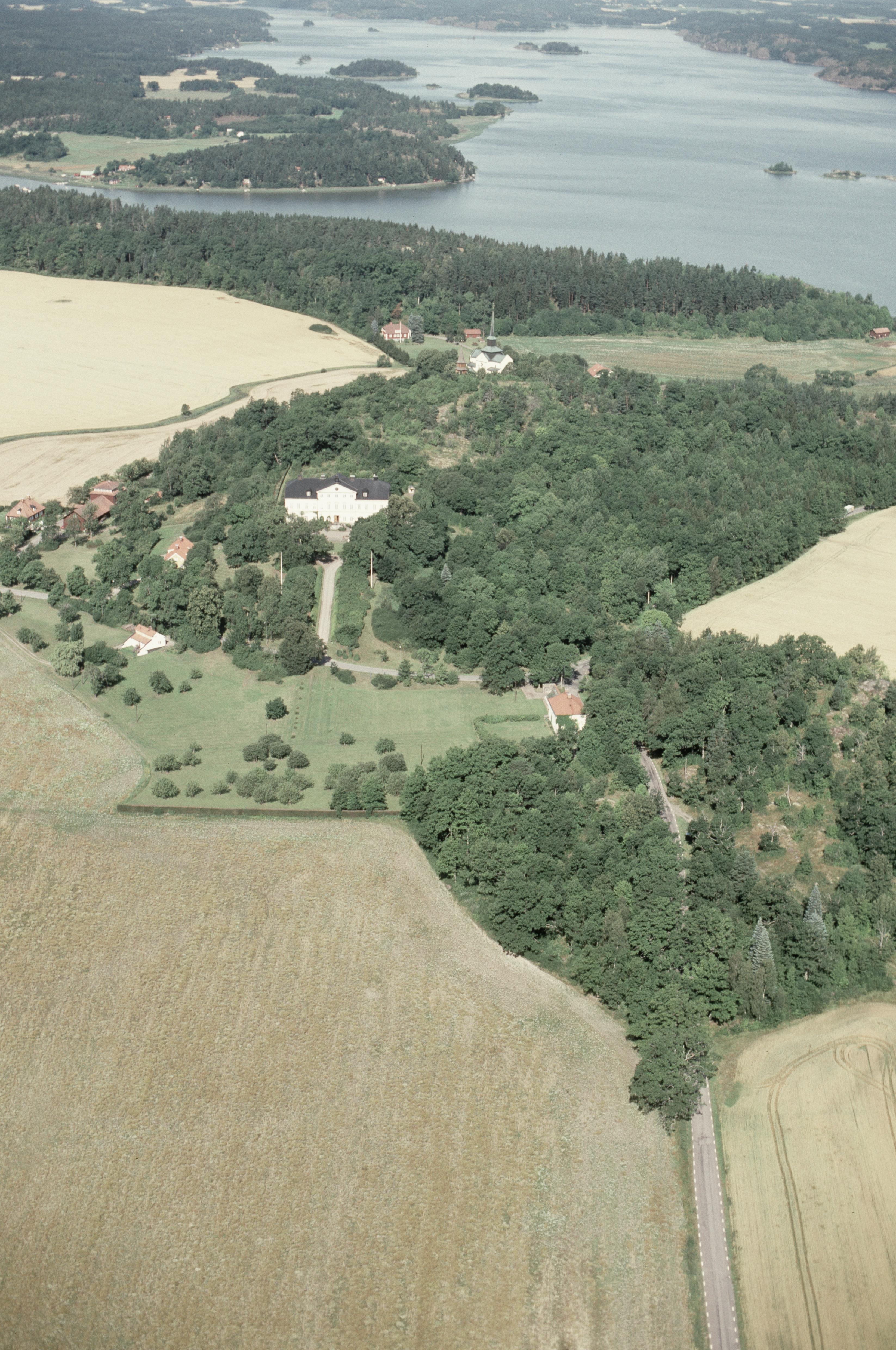 Beskrivning: Havsviken Slätbaken. Stegeborgs herrgård och Skällviks kyrka. Bilden är tagen mot (väderstreck): NV