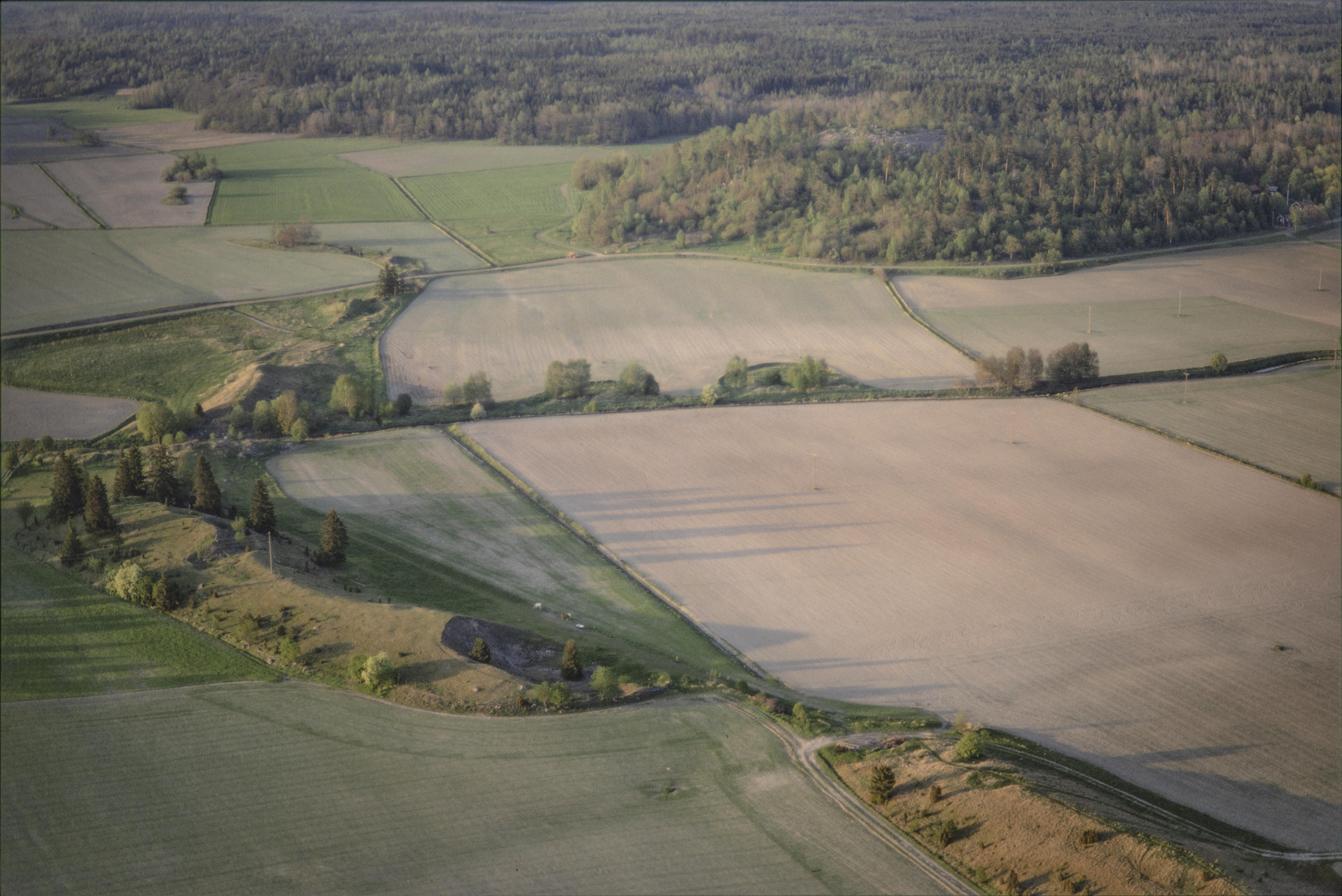 Beskrivning: Storån i Långhundraleden. I bildens nedre del stensättning och gravfält Vallby vallar RAÄnr Husby-Långhundra 158:1 och 165:1. Uppe till höger fornborgen Broborg RAÄnr Husby-Långhundra 156:1. Bilden är tagen mot (väderstreck): NO
