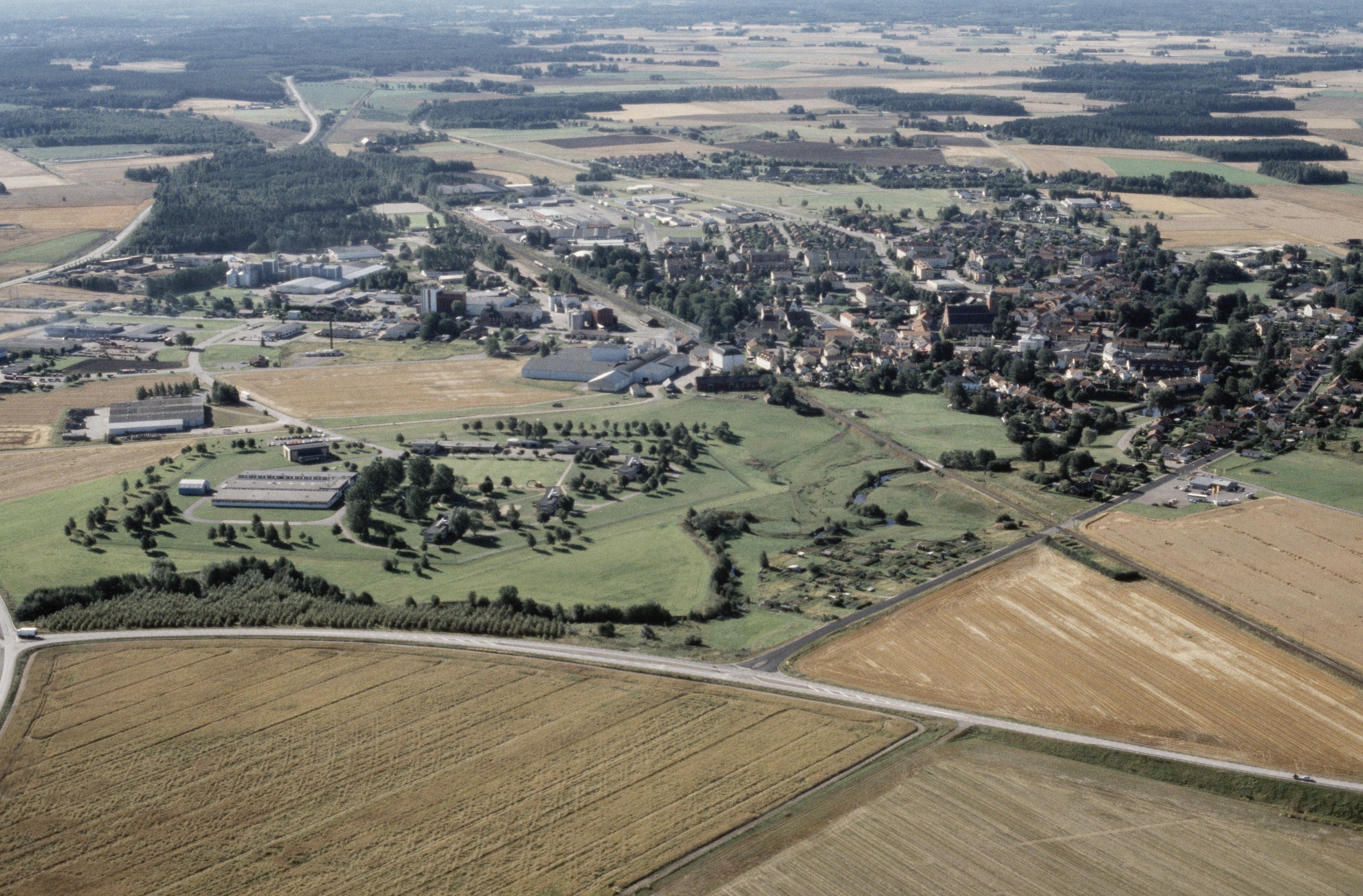 Beskrivning: Skenaån och fornlämningsområde vid Östanå med boplats RAÄnr Skänninge 33:1 m.fl. I bildens övre del Skänninge tätort. Vårfrukyrkan uppe till högert. Bilden är tagen mot (väderstreck): SSO