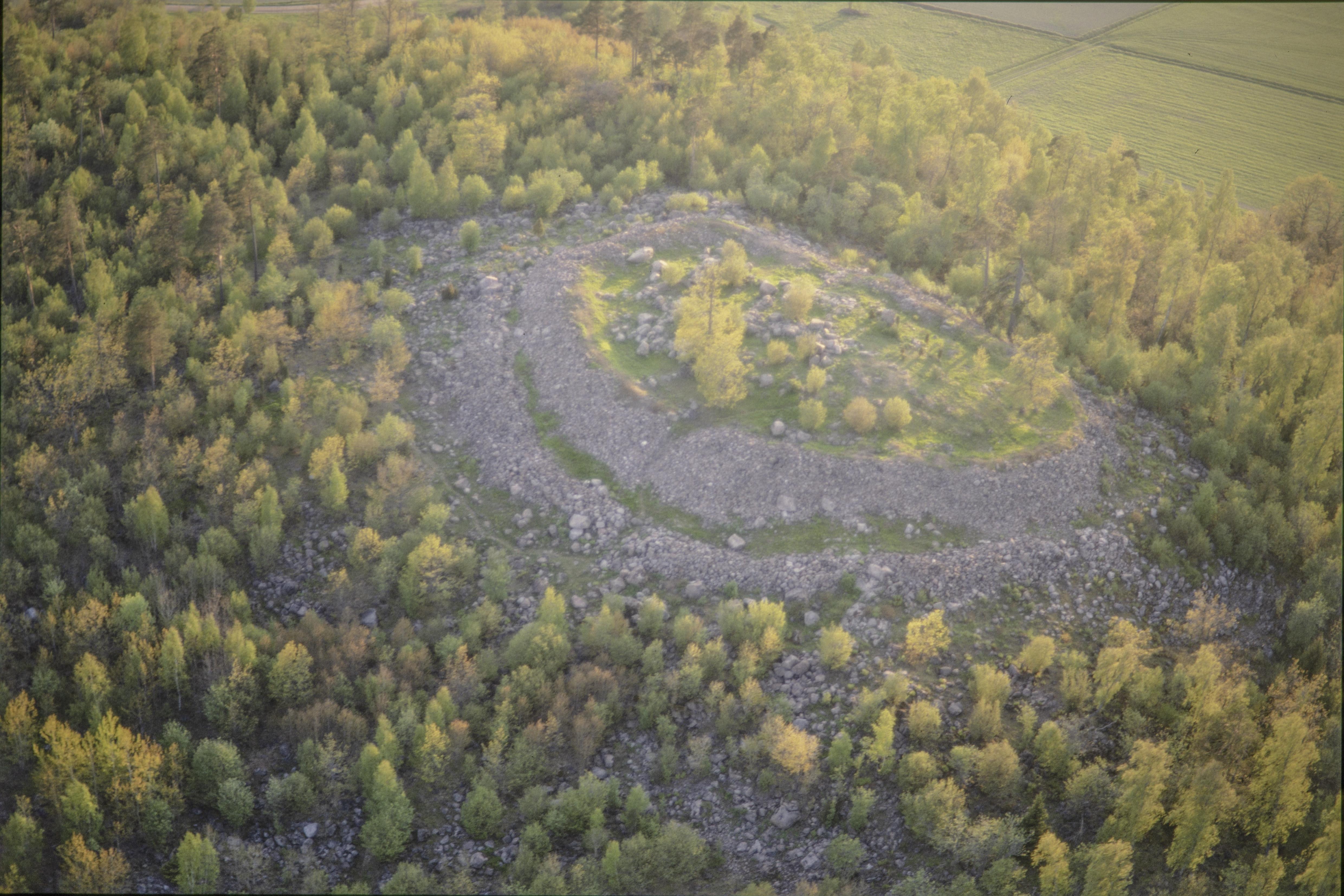 Beskrivning: Område norr om Lilla Vallby och Storån i Långhundraleden. Fornborgen Broborg RAÄnr Husby-Långhundra 156:1 vid bildens mitt. Bilden är tagen mot (väderstreck): VNV