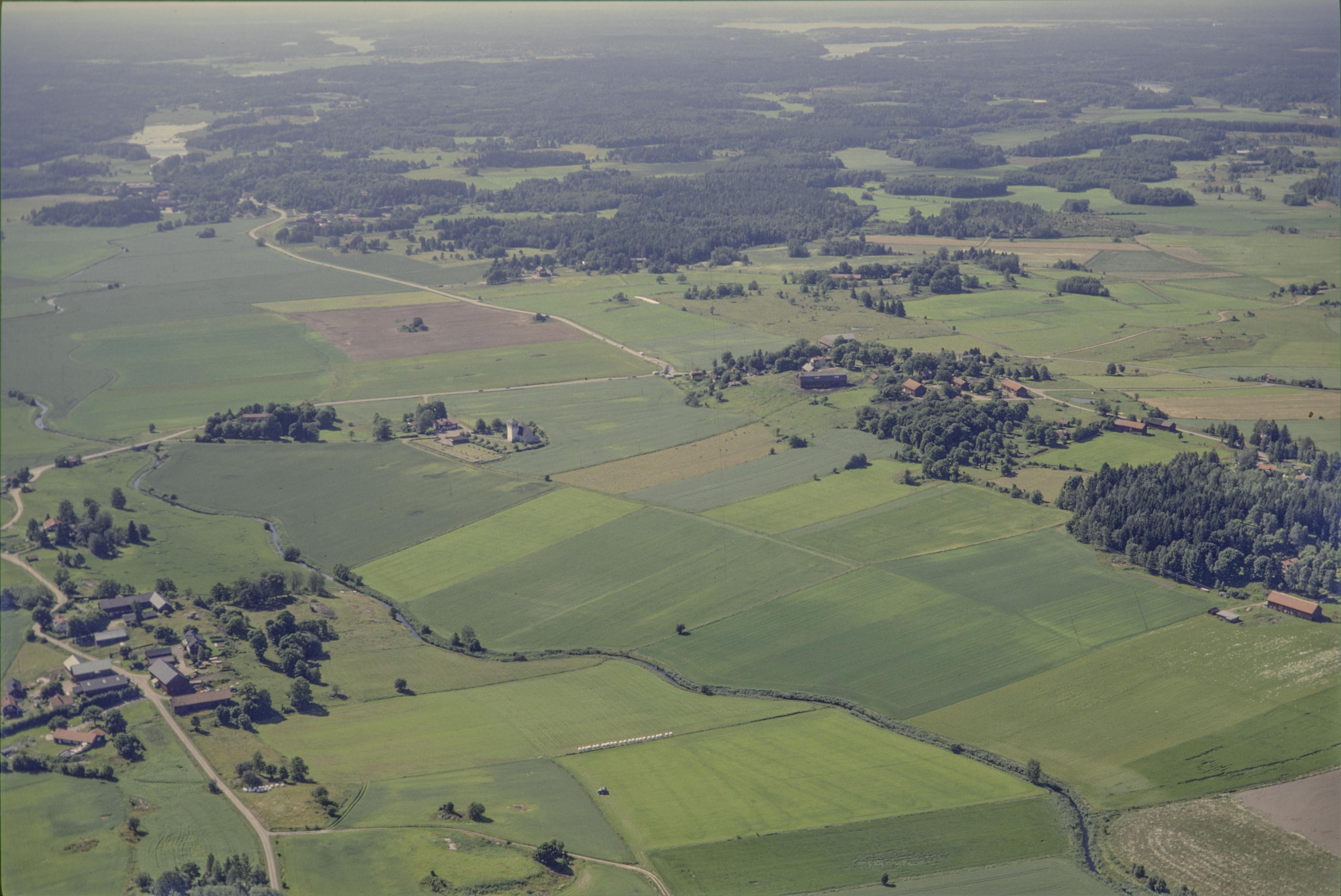Beskrivning: Husby-Sjuhundra kyrka och kyrkby vid Husbyån. Vid kyrkan runristningar RAÄnr Husby-Sjuhundra 20:1-2, 21:1-2 m.fl. Sätuna uppe till höger. Bilden är tagen mot (väderstreck): V