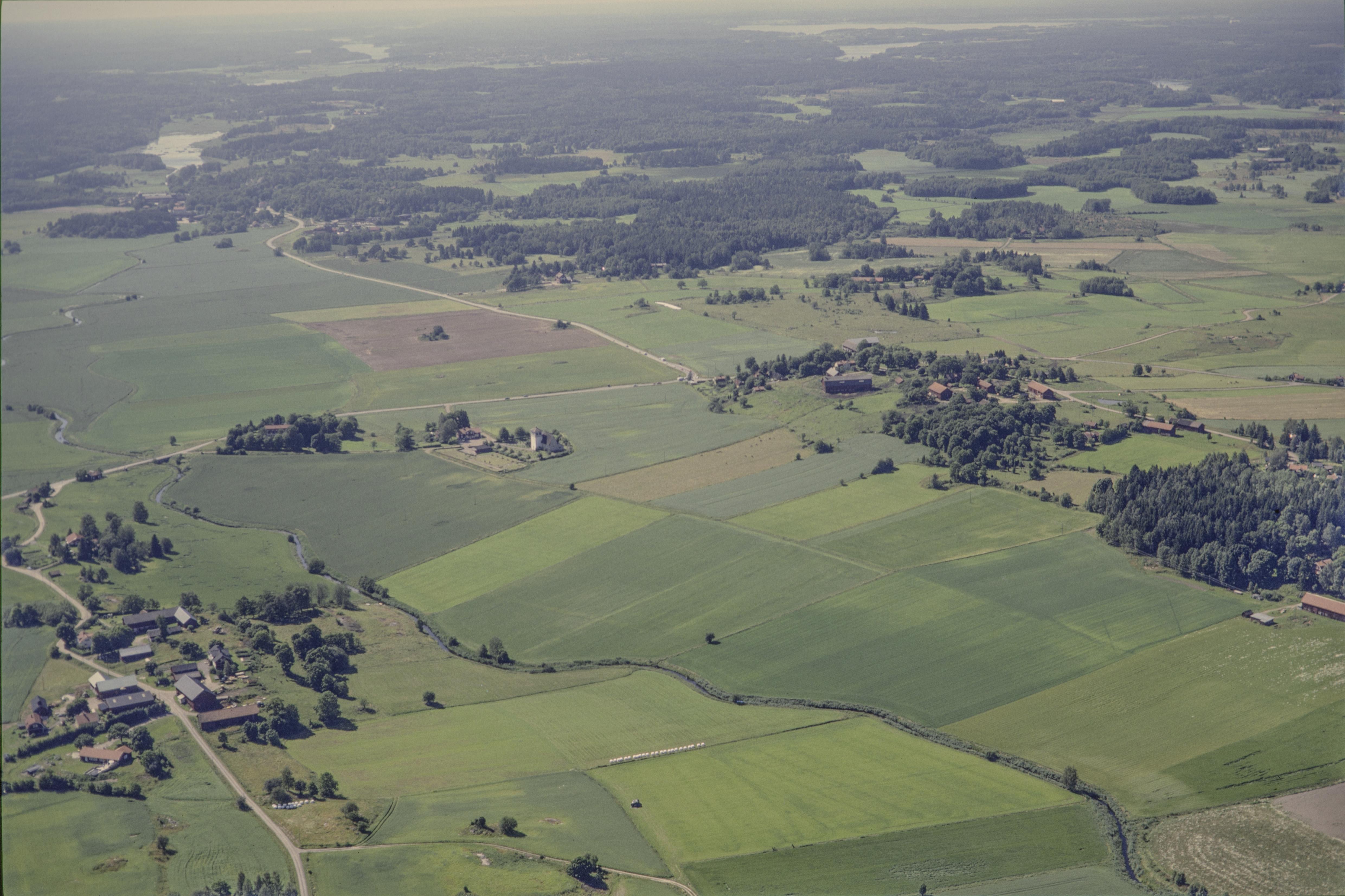 Beskrivning: Husby-Sjuhundra kyrka och kyrkby vid Husbyån. Vid kyrkan runristningar RAÄnr Husby-Sjuhundra 20:1-2, 21:1-2 m.fl. Sätuna uppe till höger. Bilden är tagen mot (väderstreck): V