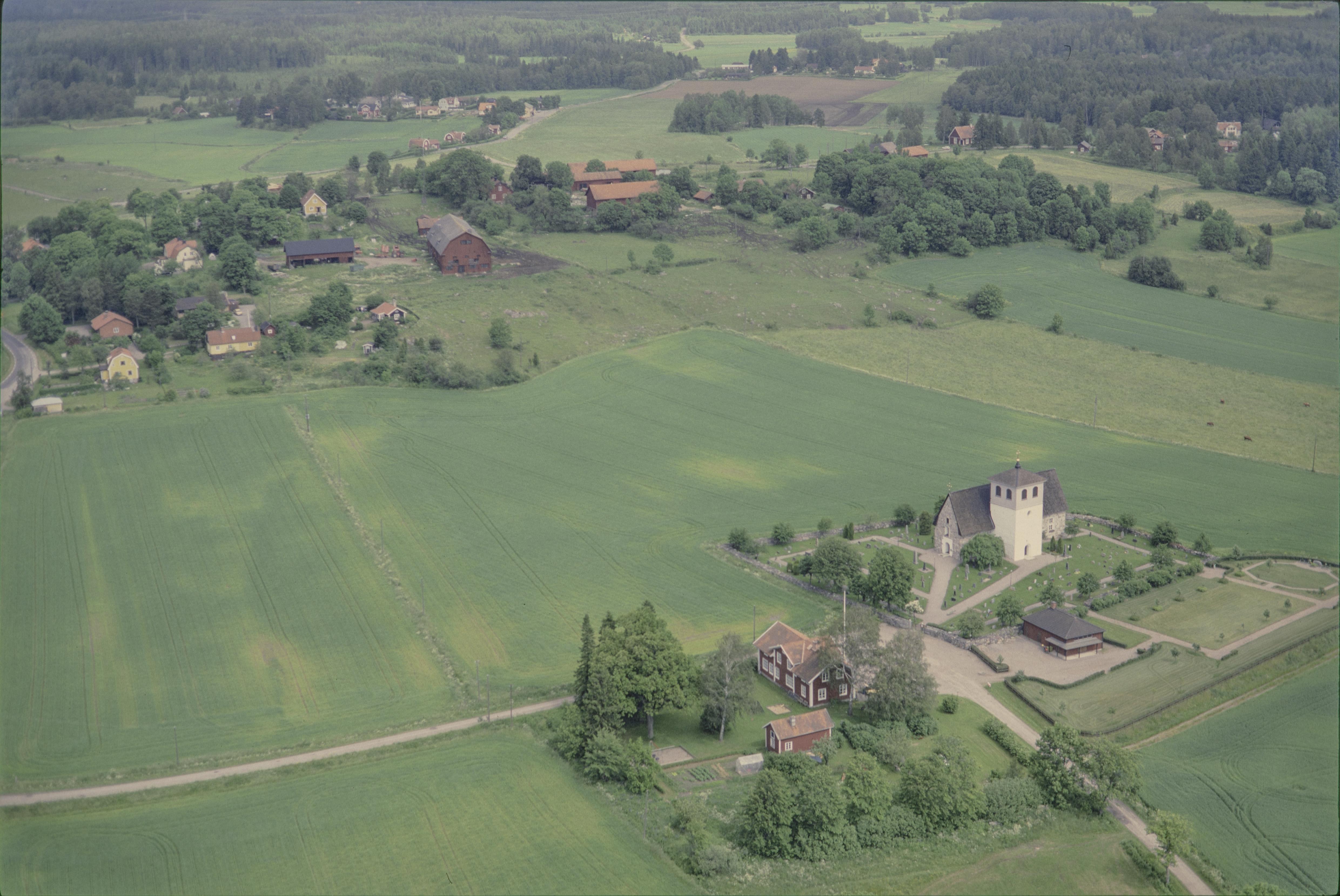 Beskrivning: Husby-Sjuhundra kyrka och Husby kyrkby vid Husbyån. Vid kyrkan runristningar RAÄnr Husby-Sjuhundra 20:1-2, 21:1-2 m.fl. Bilden är tagen mot (väderstreck): N