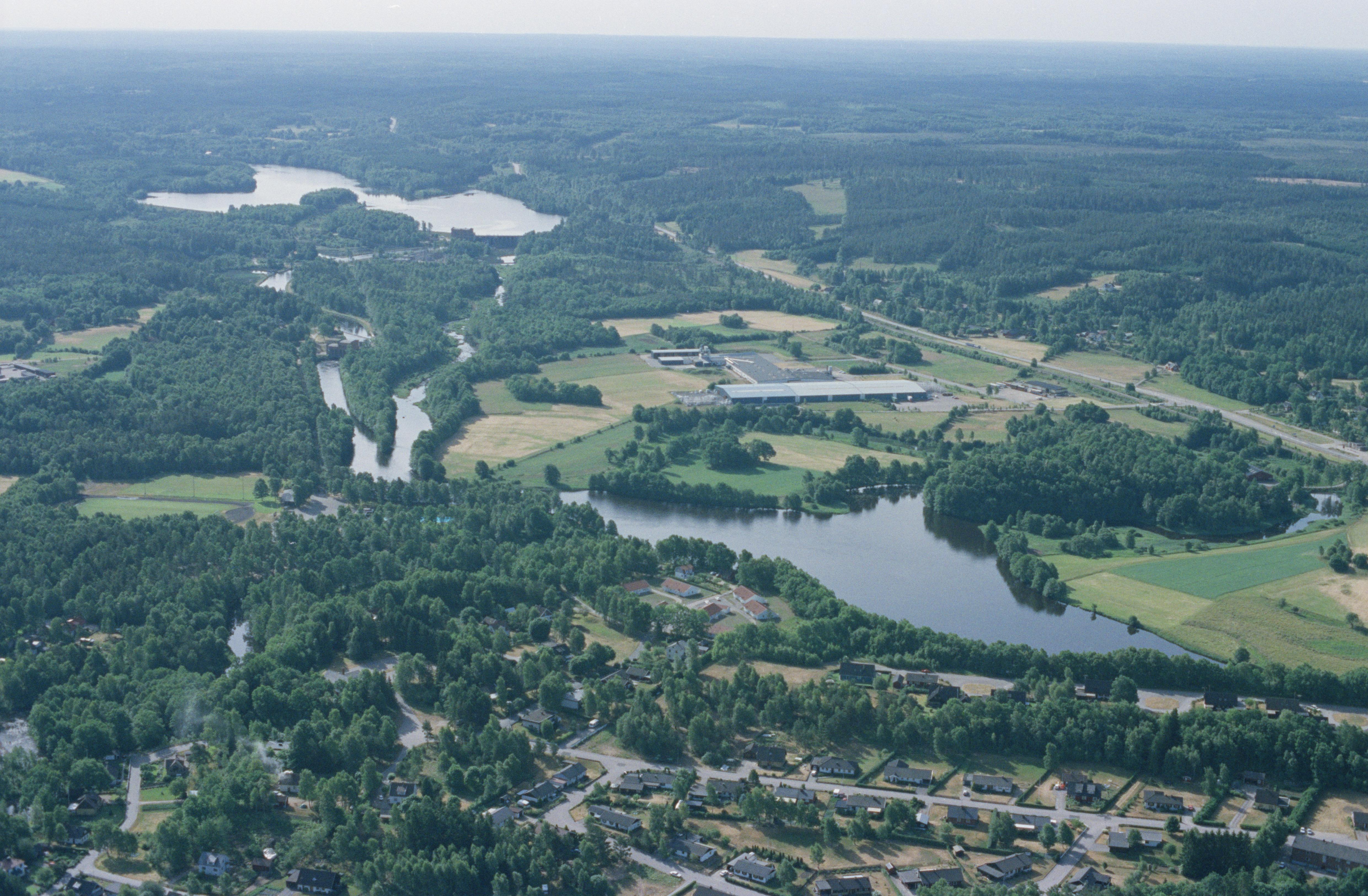 Knäreds tätort vid ån Lagan i Lagadalen. Knäreds kraftverk i bildens övre del till vänster. Bilden är tagen mot (väderstreck): Ö