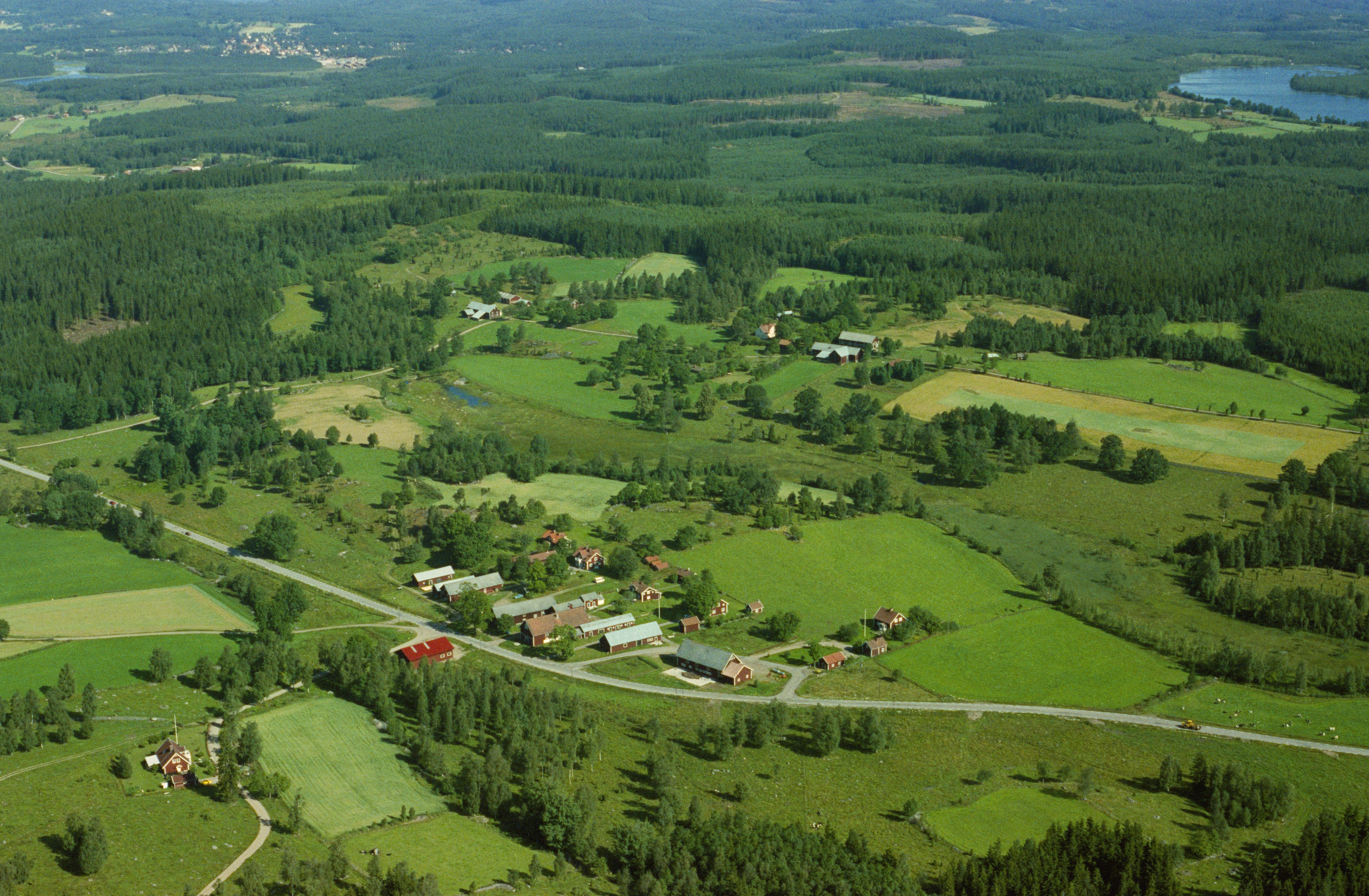 Beskrivning: Grindsbo by vid bildens mitt, uppe till höger Sprängsbo. Vägmärke RAÄnr Svinhult 105:1 vid vägen. Bilden är tagen mot (väderstreck): NV