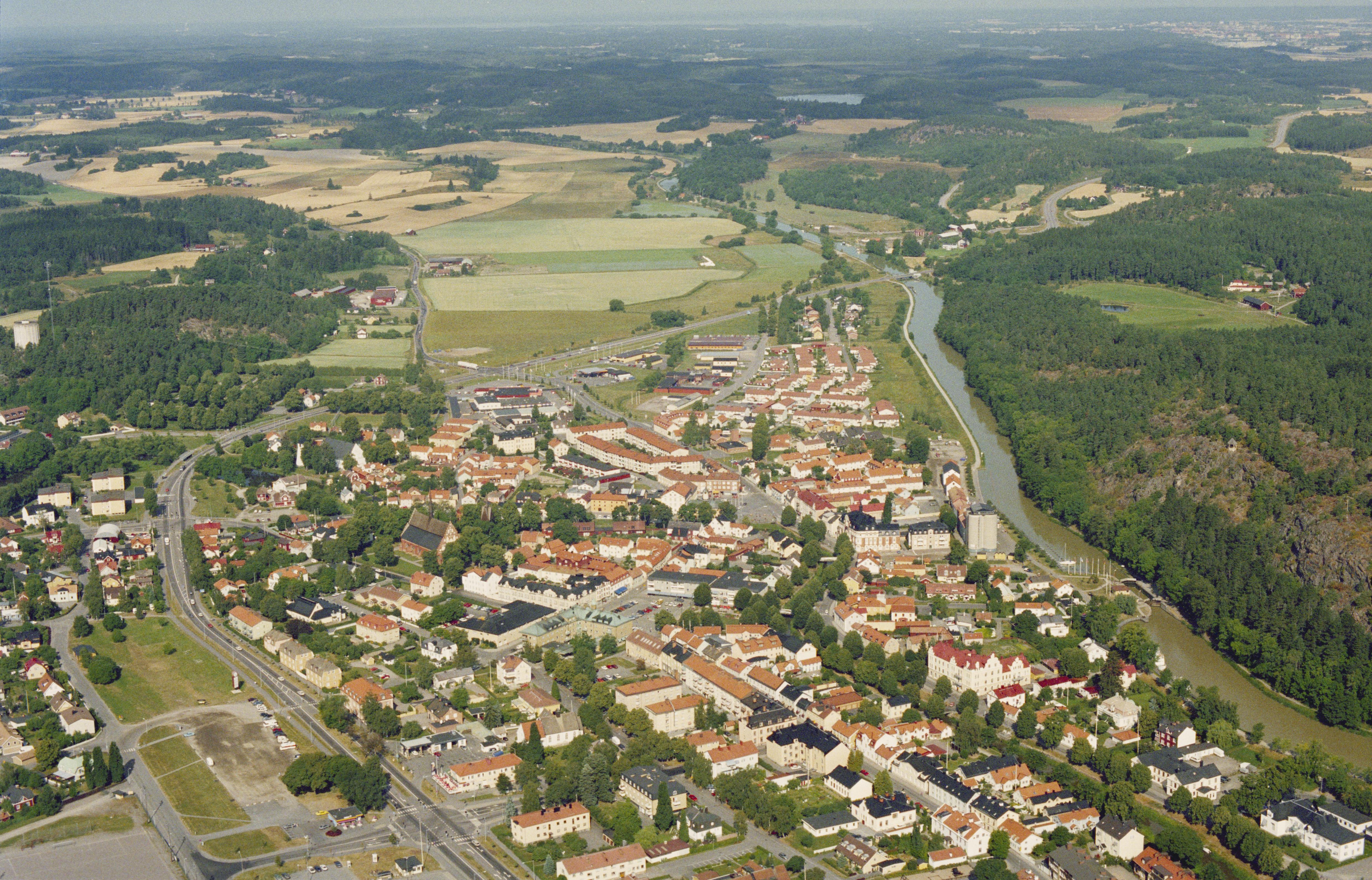 Beskrivning: Anmärkning (övrig): Riksintresse-nr/namn: E66 - Söderköping. Socken: Söderköping. Motivering: Småstad belägen vid en uppgrundad havsvik och betydelsefull vattenled, som i planmönster, dominerande kyrkobyggnader och bebyggelsekaraktär ger en bild av en av hög- och senmedeltidens viktigaste städer. - Uttryck för riksintresset: Det i stort sett oförändrade medeltida gatunätet, den äldre tomtstrukturen, kyrkorna och deras dominerande roll i stadsbilden samt medeltida profanbyggnader, källare och andra lämningar. Den förindustriella stadens småskaliga träbebyggelse med gårdar och ekonomibyggnader. Stadens siluett och kontakten med vattnet, Ramunderberget och det omgivande landskapet. - I området igår även: Söderköp(…) Texten i detta fält har förkortats vid migrering till e-arkivet. Se filbilagan extra.xml för fullständig information under note_archivist. Beskrivning: Storån och till höger Göta kanal vid Ramunderberget i Söderköpings stad. Sankt Laurentii kyrka till vänster under bildens mitt. Bilden är tagen mot (väderstreck): NV Fotosyfte: Flygbildsdokumentation