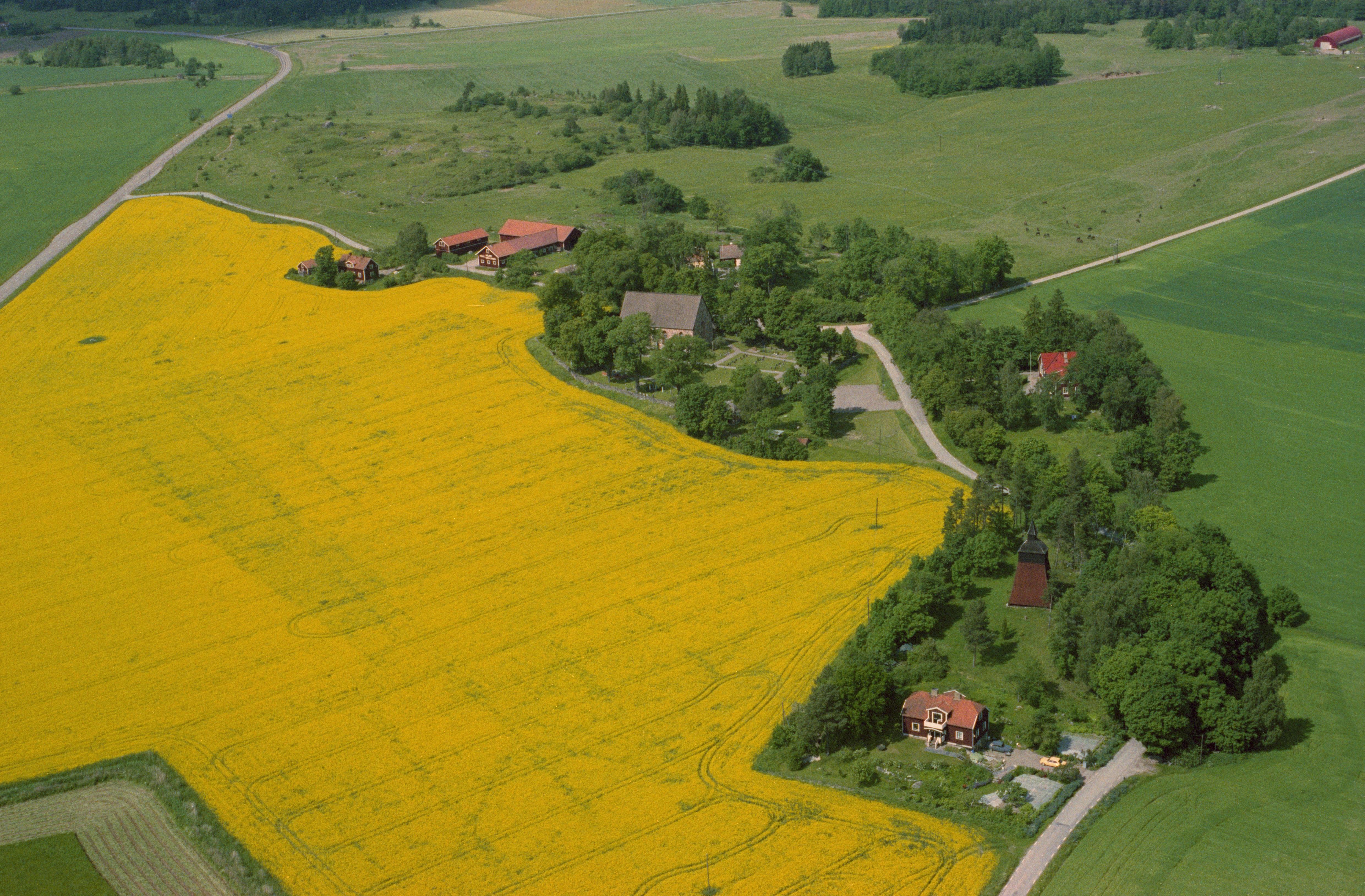 Beskrivning: Håtuna kyrka och kyrkby. Till höger om bildens mitt Prästgårdens gamla tomt RAÄnr Håtuna 157:1. Bilden är tagen mot (väderstreck): NNV