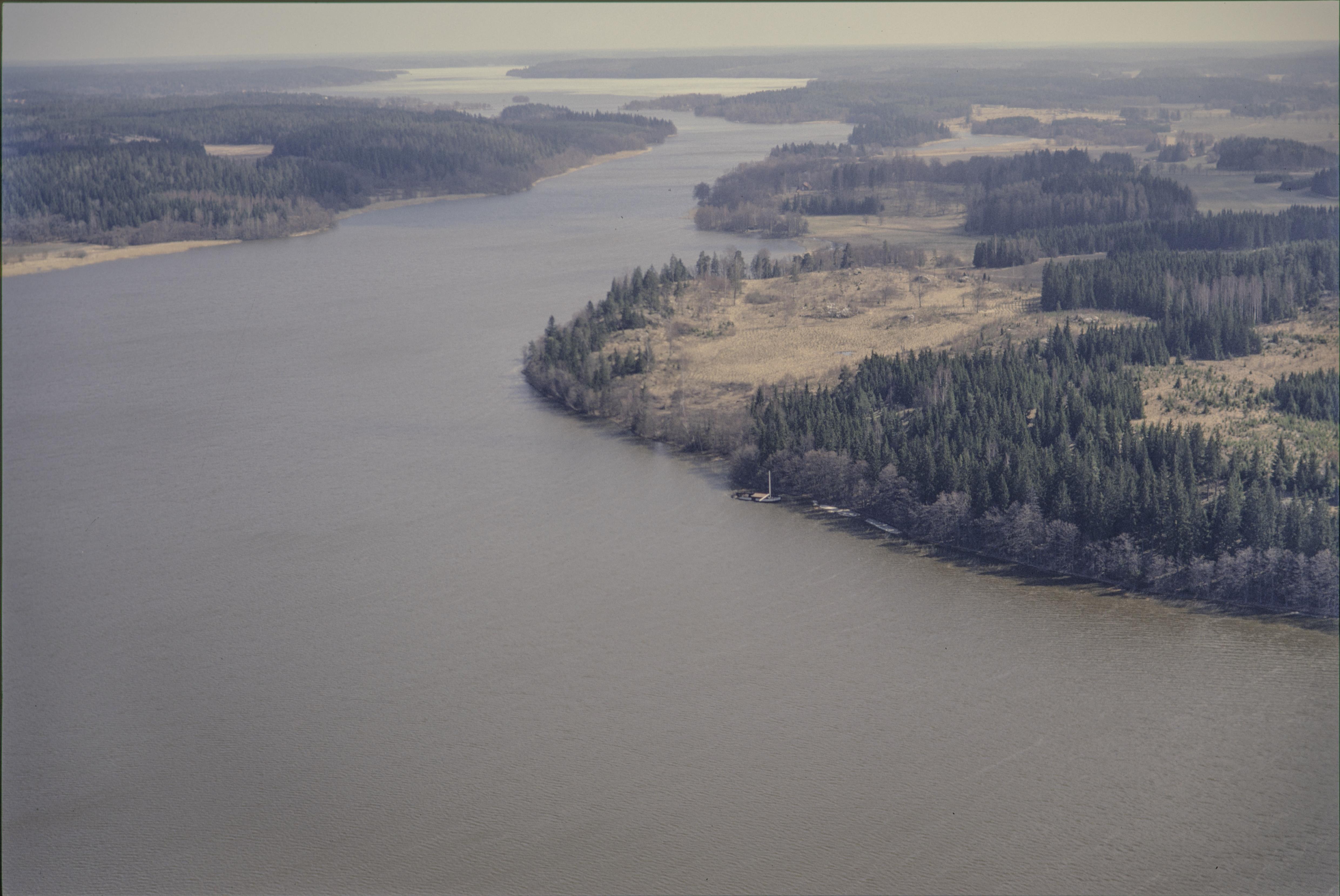 Beskrivning: Håtunaviken i Mälaren. Viken markerar gränsen mellan socknen Håtuna och Sankt Per (till vänster). Till höger om bildens mitt gravfält RAÄnr Håtuna 54:1 vid Håtunaholms herrgård. I bildens övre del Signhildsberg. Bilden är tagen mot (väderstreck): SO