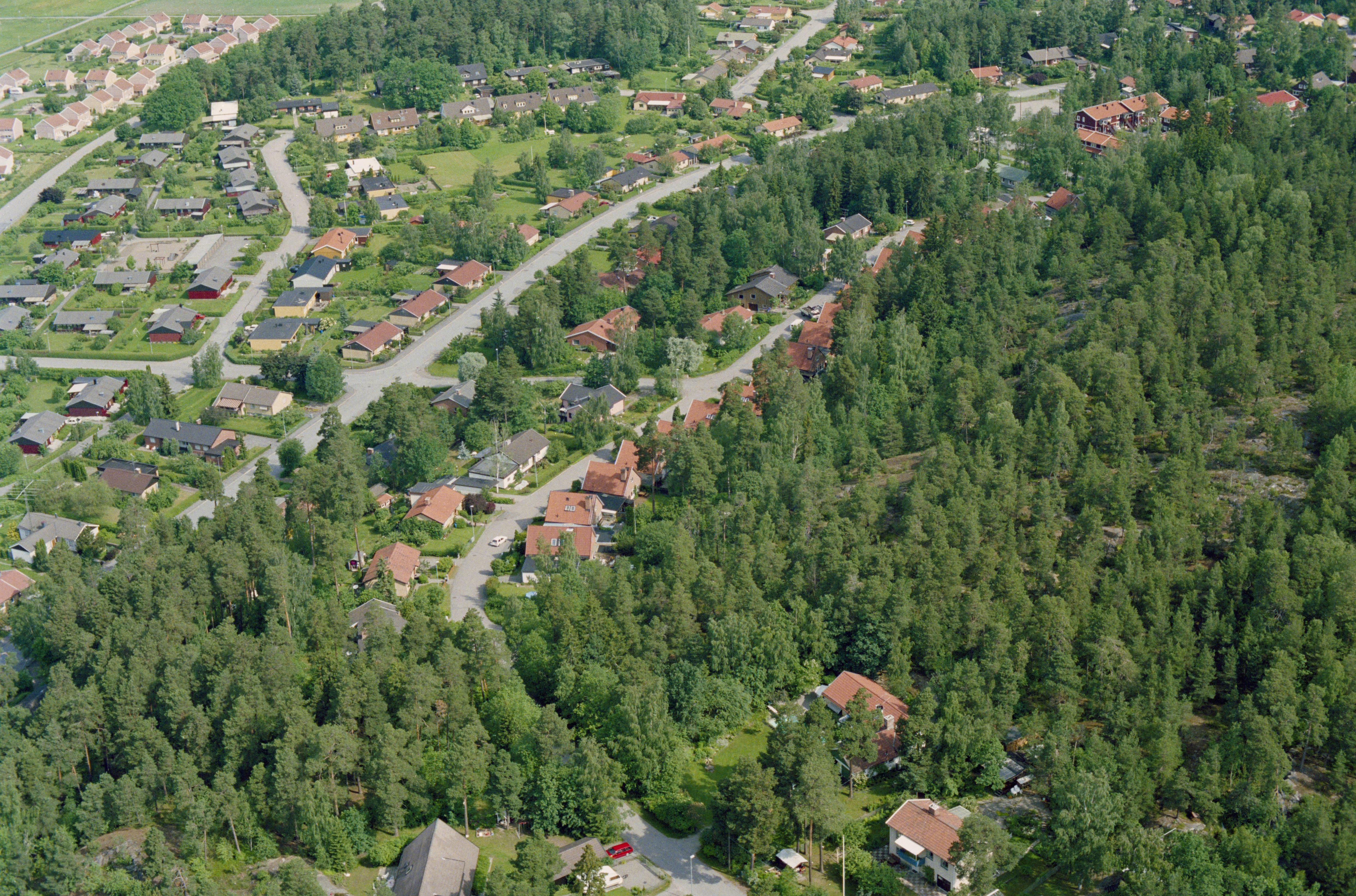 Beskrivning: Kungsängens tätort. Rankhusvägen vid bildens mitt. Bilden är tagen mot (väderstreck): NNV
