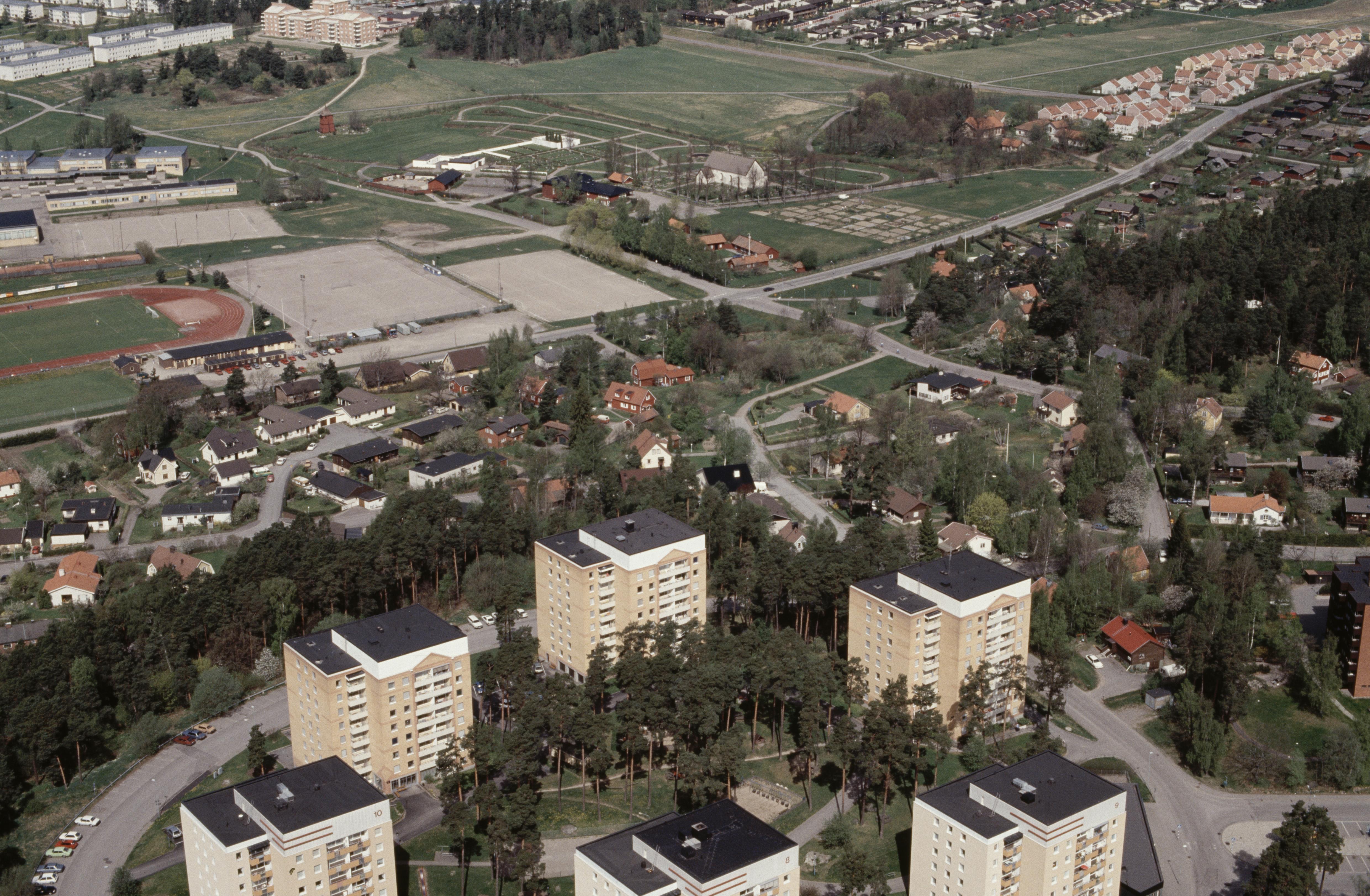Beskrivning: Kungsängens tätort. Kungsängens kyrka över bildens mitt. Bilden är tagen mot (väderstreck): NV
