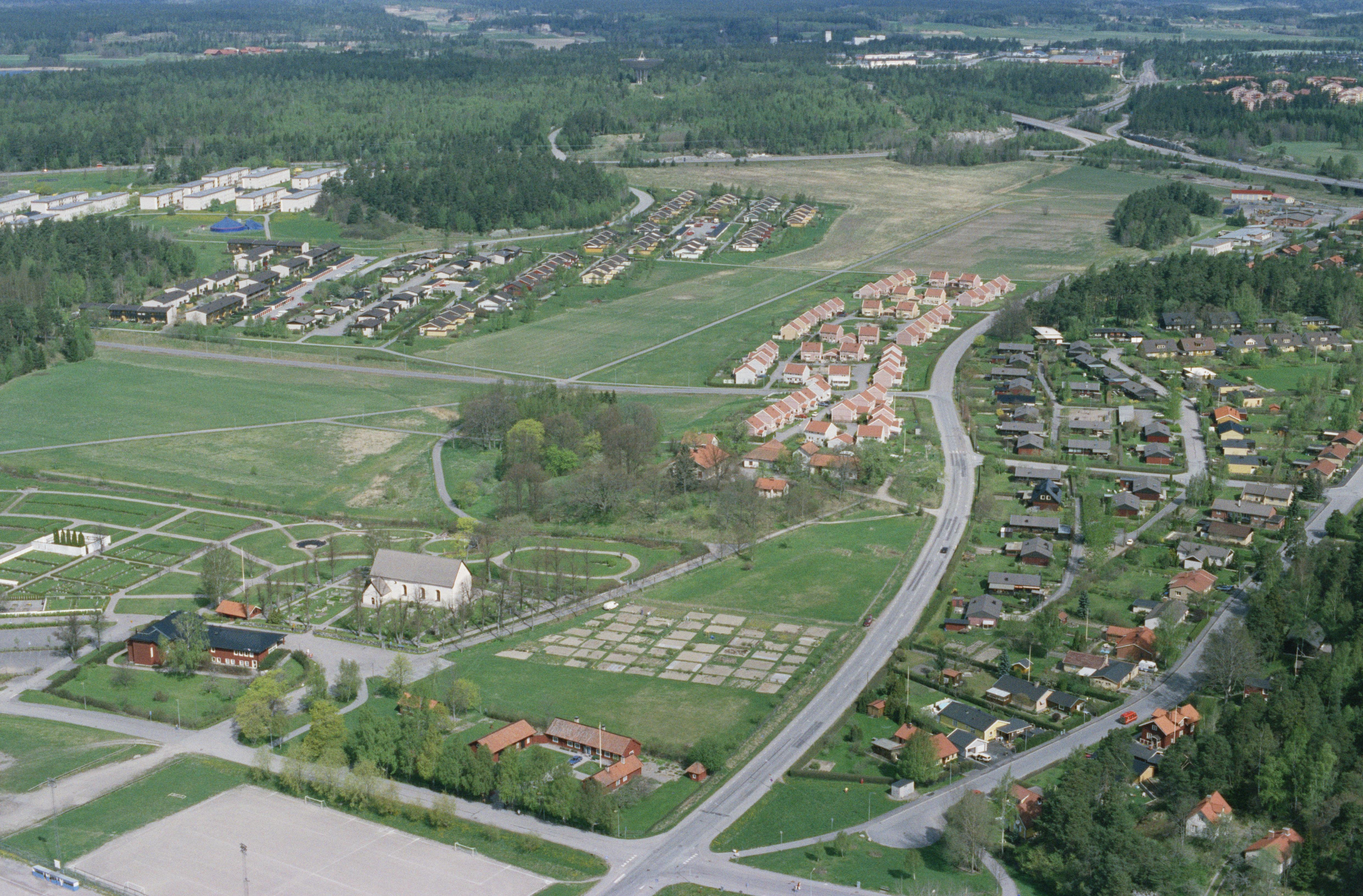 Beskrivning: Kungsängens tätort. Kungsängens kyrka vid bildens mitt. Bilden är tagen mot (väderstreck): NNV