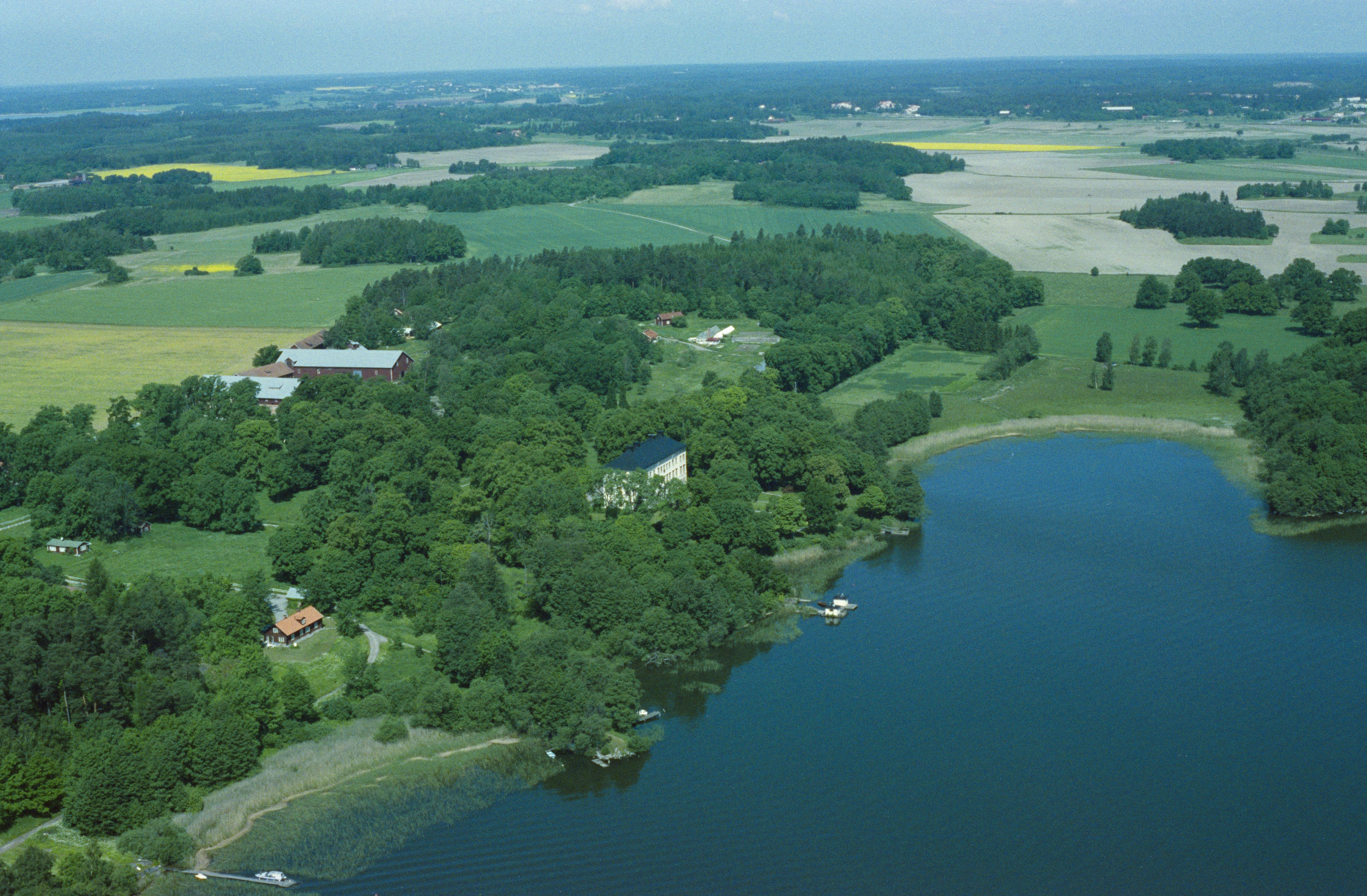 Beskrivning: Lennartsnäs herrgård vid fjärden Görväln i Östra Mälaren. Vid stranden minnesmärke RAÄnr Kungsängen 76:1-3. Bilden är tagen mot (väderstreck): NV
