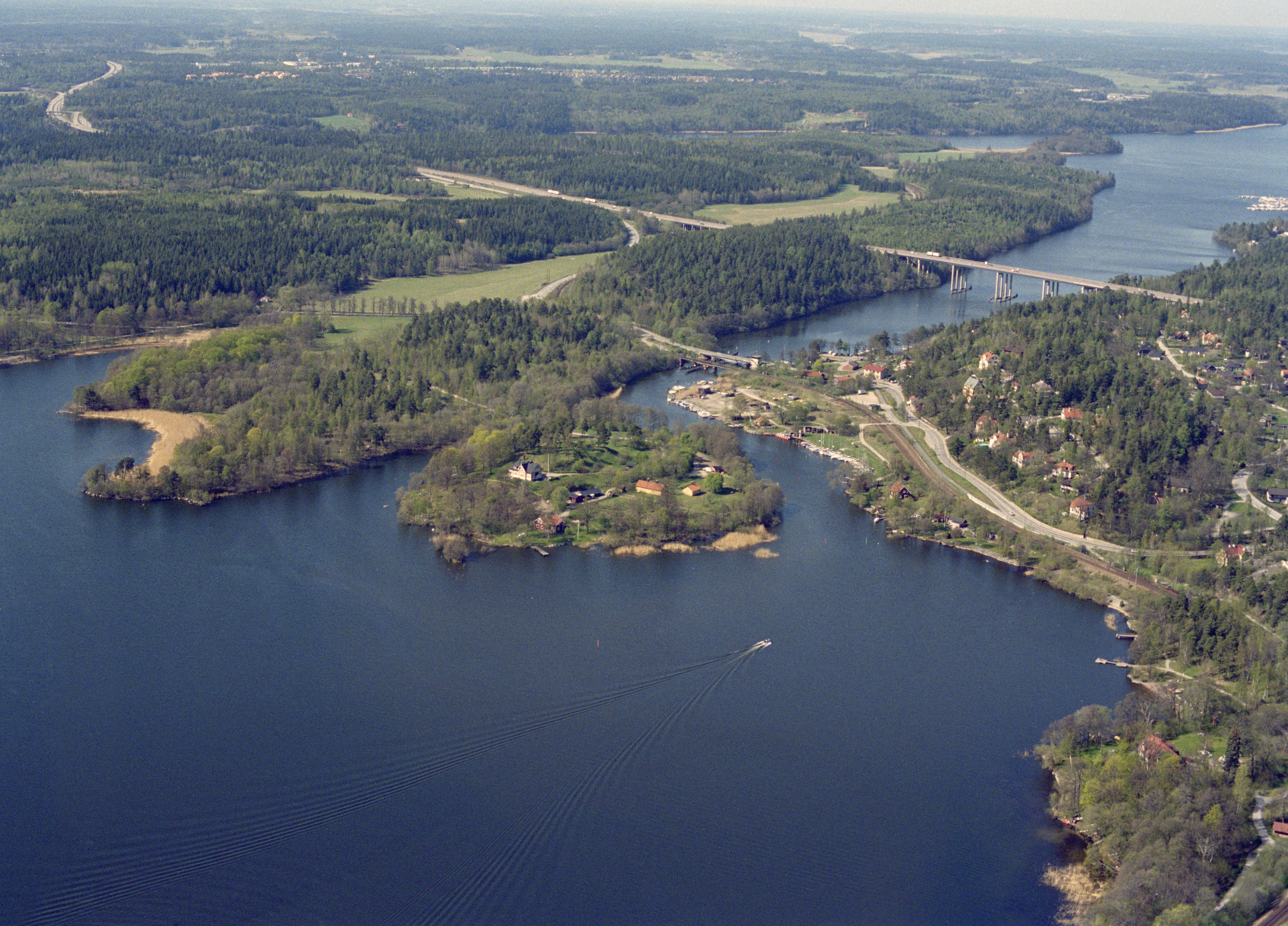 Beskrivning: Görväln i Mälaren. Stäketsön, Stäketsholmen med borgruin Sankt Eriks borg RAÄnr Kungsängen 73:1 och gränsen till Järfälla socken (tätorten Stäket till höger). Bilden är tagen mot (väderstreck): NNV