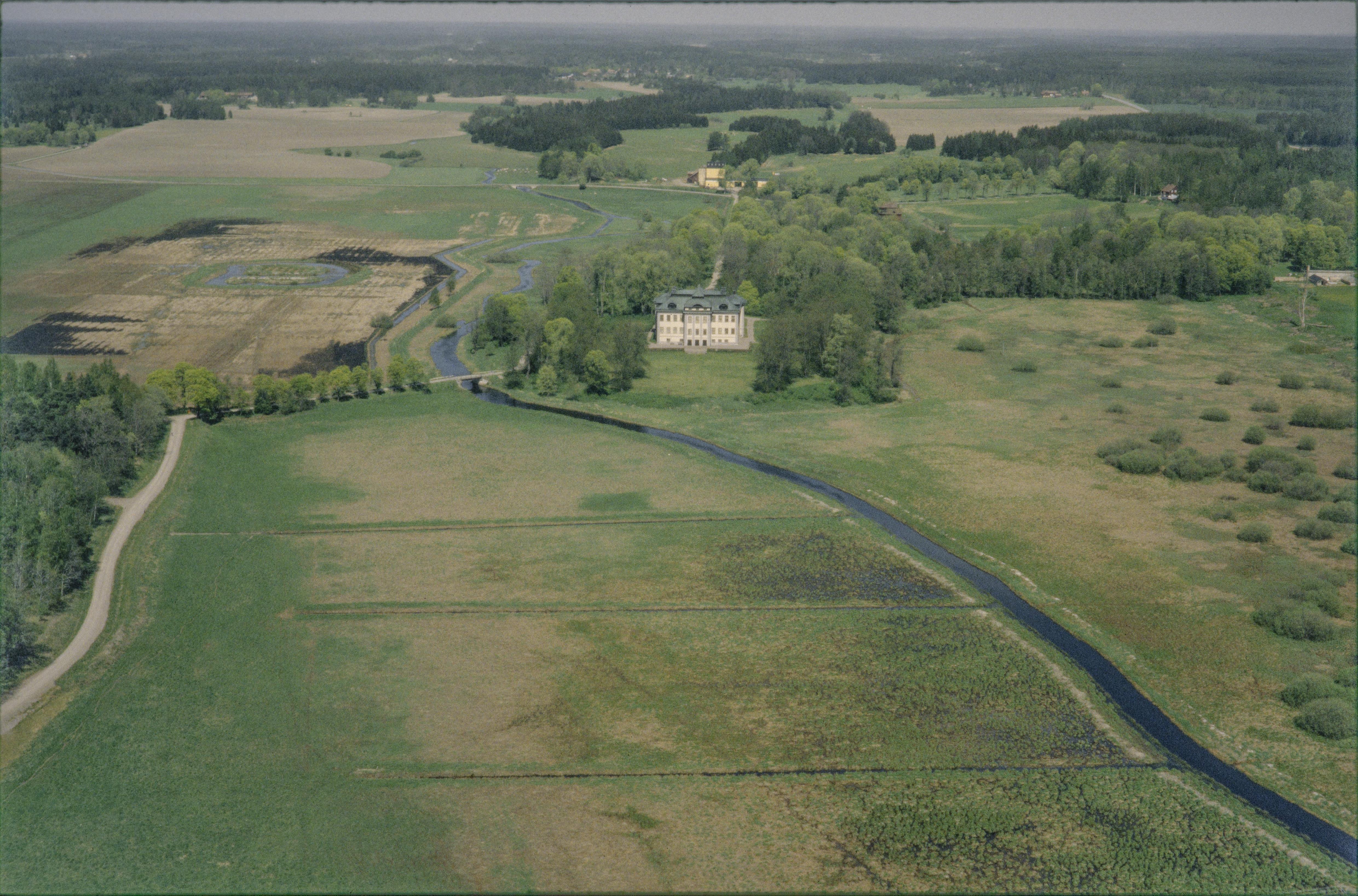 Beskrivning: Salsta slott byggnadsminne RAÄnr Lena 7:1 vid Fyrisån. Tensta socken uppe till vänster. Bilden är tagen mot (väderstreck): N