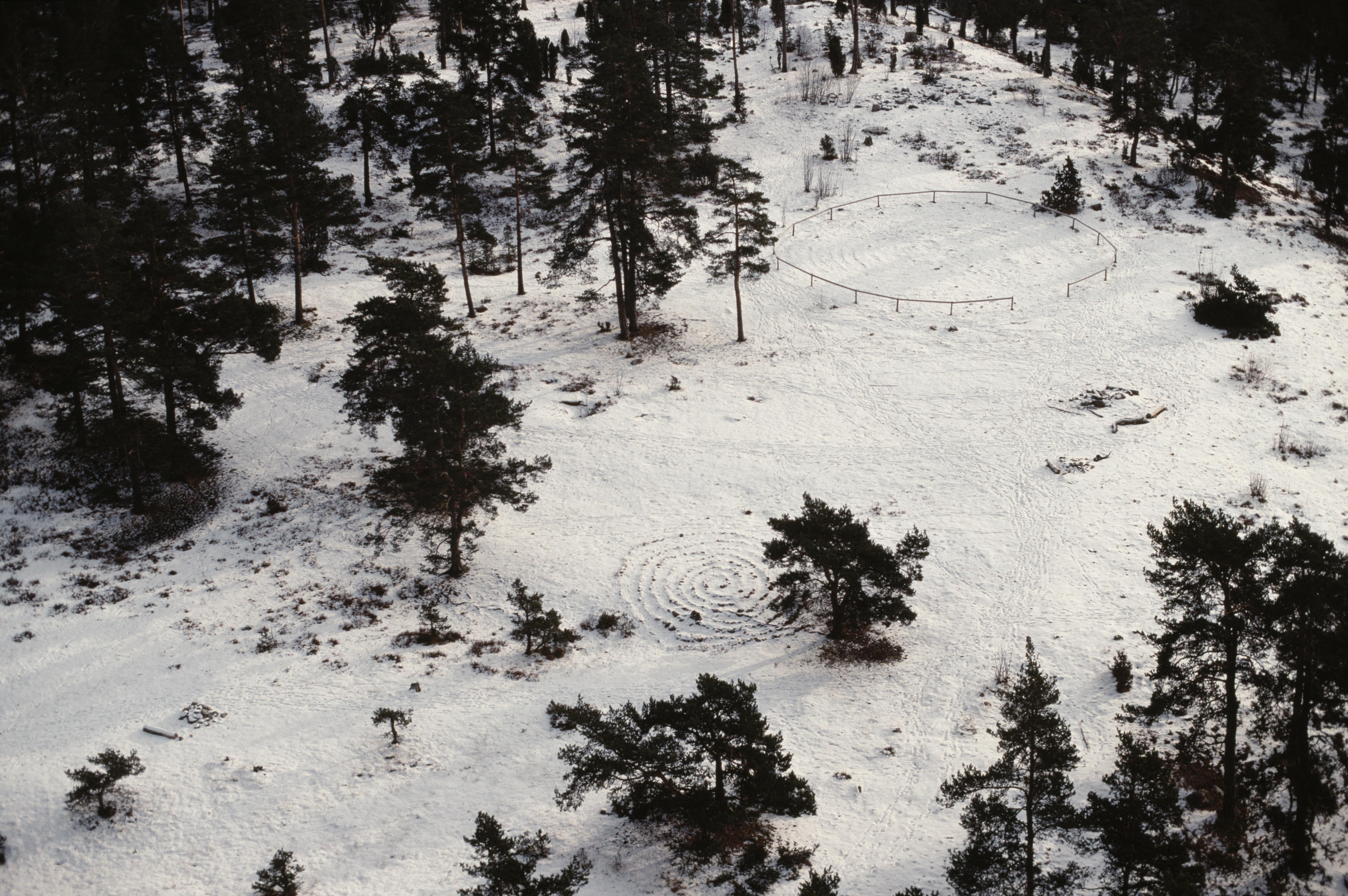 Beskrivning: Rösaringsåsen. Vid bildens mitt en sentida, ny labyrint. Uppe till höger labyrint RAÄnr Låssa 24:1 vid gravfält Låssa 23:1. I bildens övre del södra änden av färdväg (Rösarings processionsväg) RAÄnr Låssa 85:1. Bilden är tagen mot (väderstreck): NO