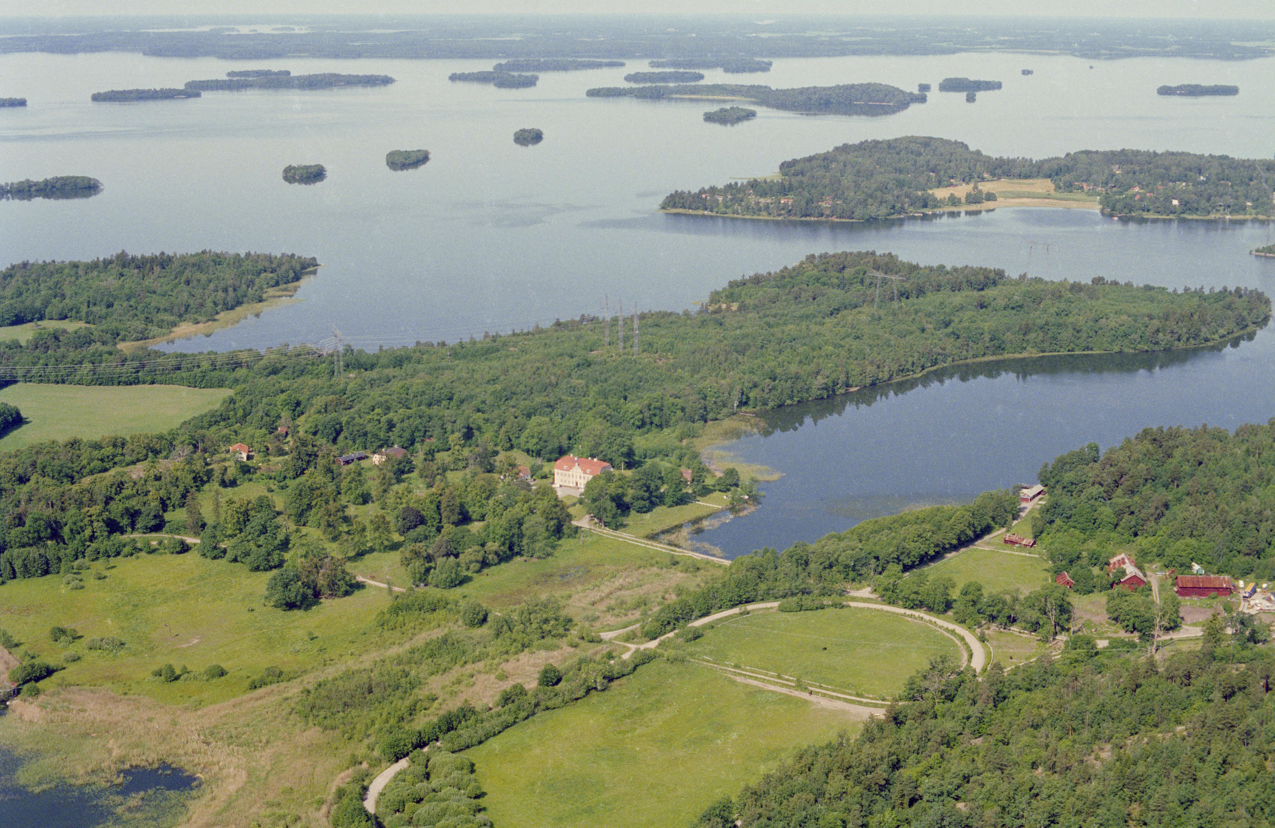 Beskrivning: Ådö herrgård på Lagnö mellan Brofjärden och Norra Björkfjärden i Mälaren. Till höger om bildens mitt bro RAÄnr Låssa 78:1. Bilden är tagen mot (väderstreck): VNV