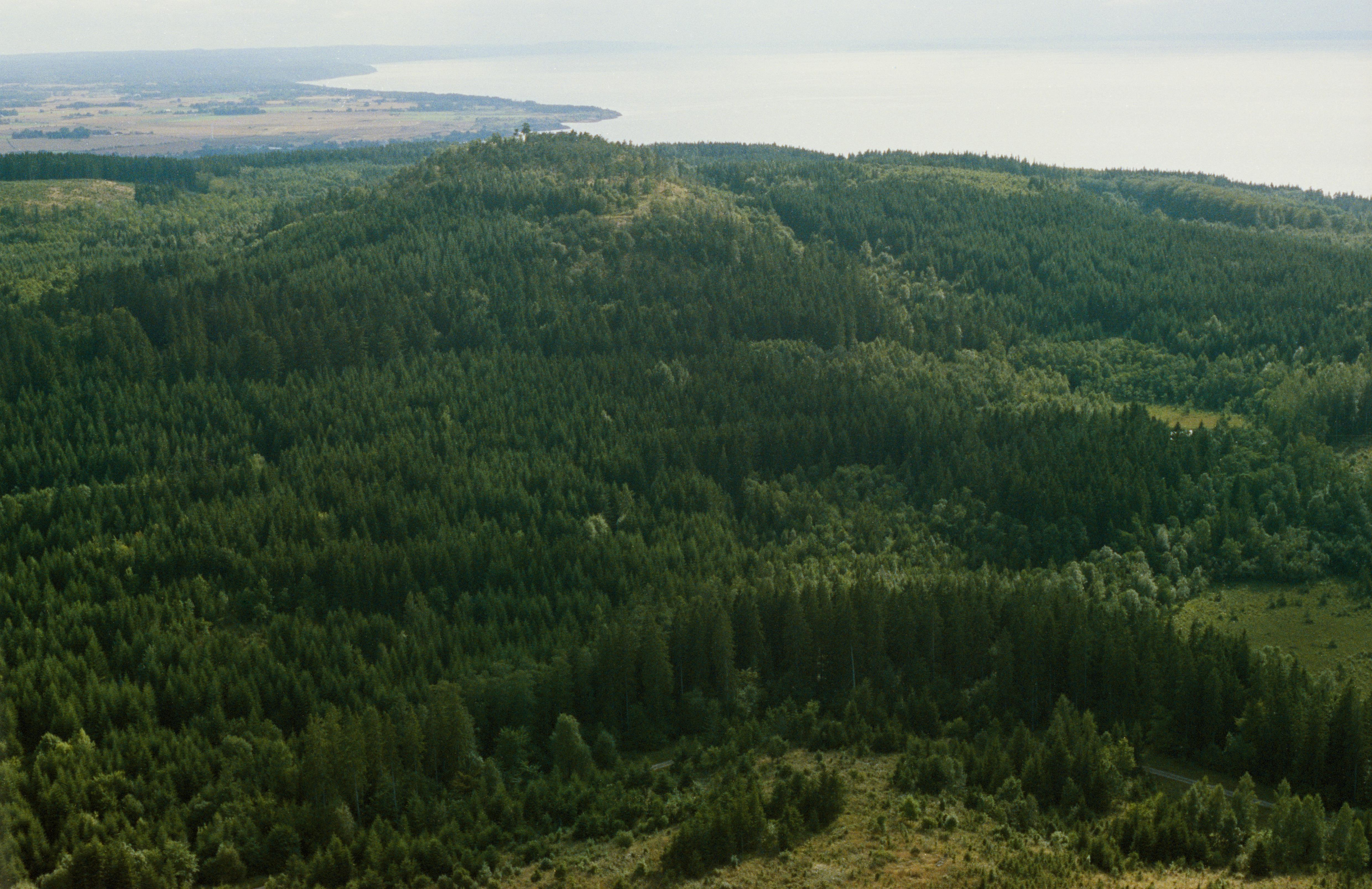 Beskrivning: I bildens övre del fornborg RAÄnr Västra Tollstad 17:1 på Hjässan, Omberg. Bilden är tagen mot (väderstreck): SSV