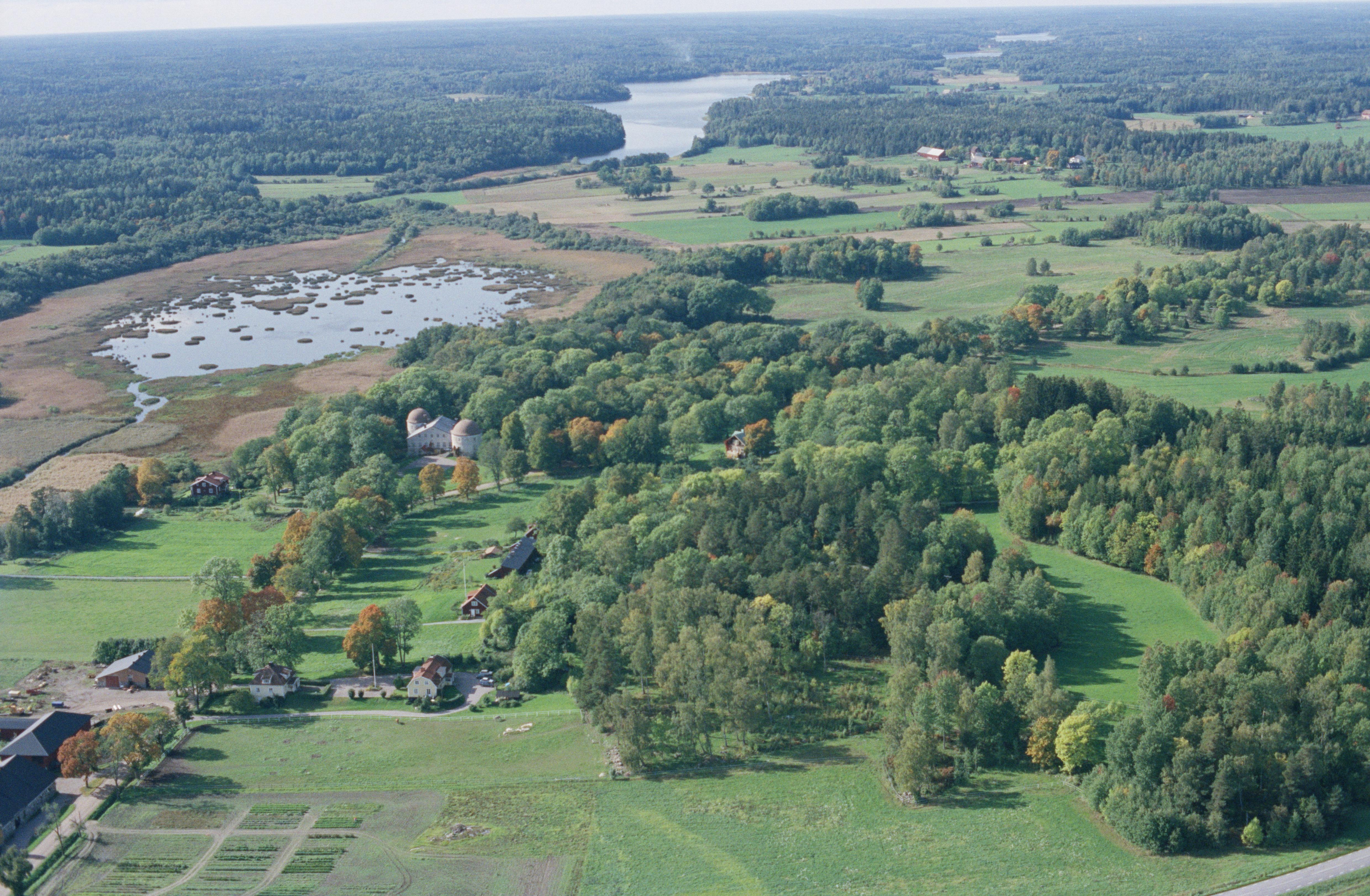 Beskrivning: Penningby slott, byggnadsminne Länna-Penningby 1:4, vid Väsbysjön och gravfält RAÄnr Länna 61:1. I bildens övre del Länna kyrksjö. Bilden är tagen mot (väderstreck): SV