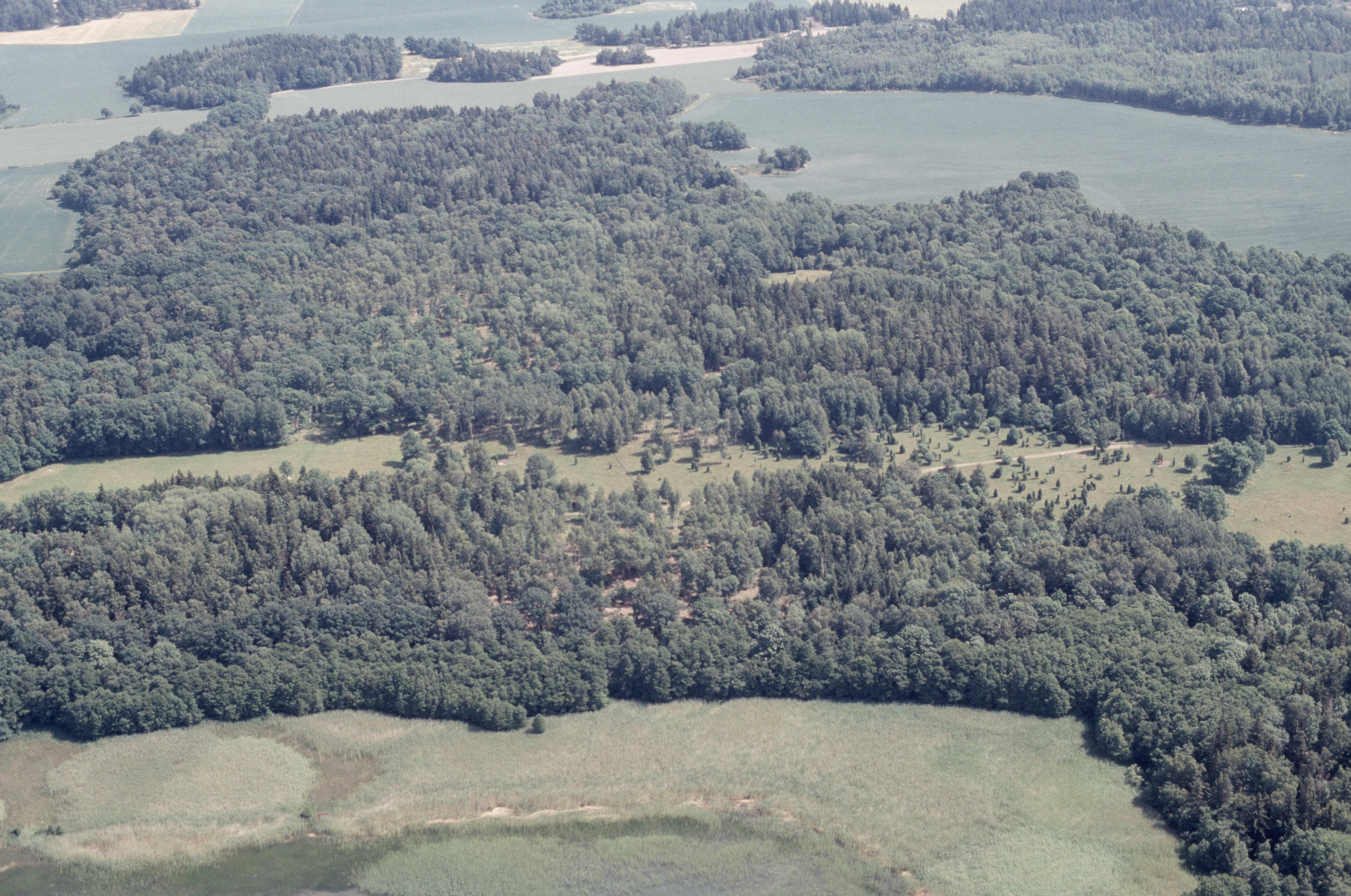 Beskrivning: Munsön vid Svinsundet i Mälaren. I bildens nedre del naturreservatet Väsby hage. Vid bildens mitt fossil åker RAÄnr Munsö 30:1. Bilden är tagen mot (väderstreck): Ö
