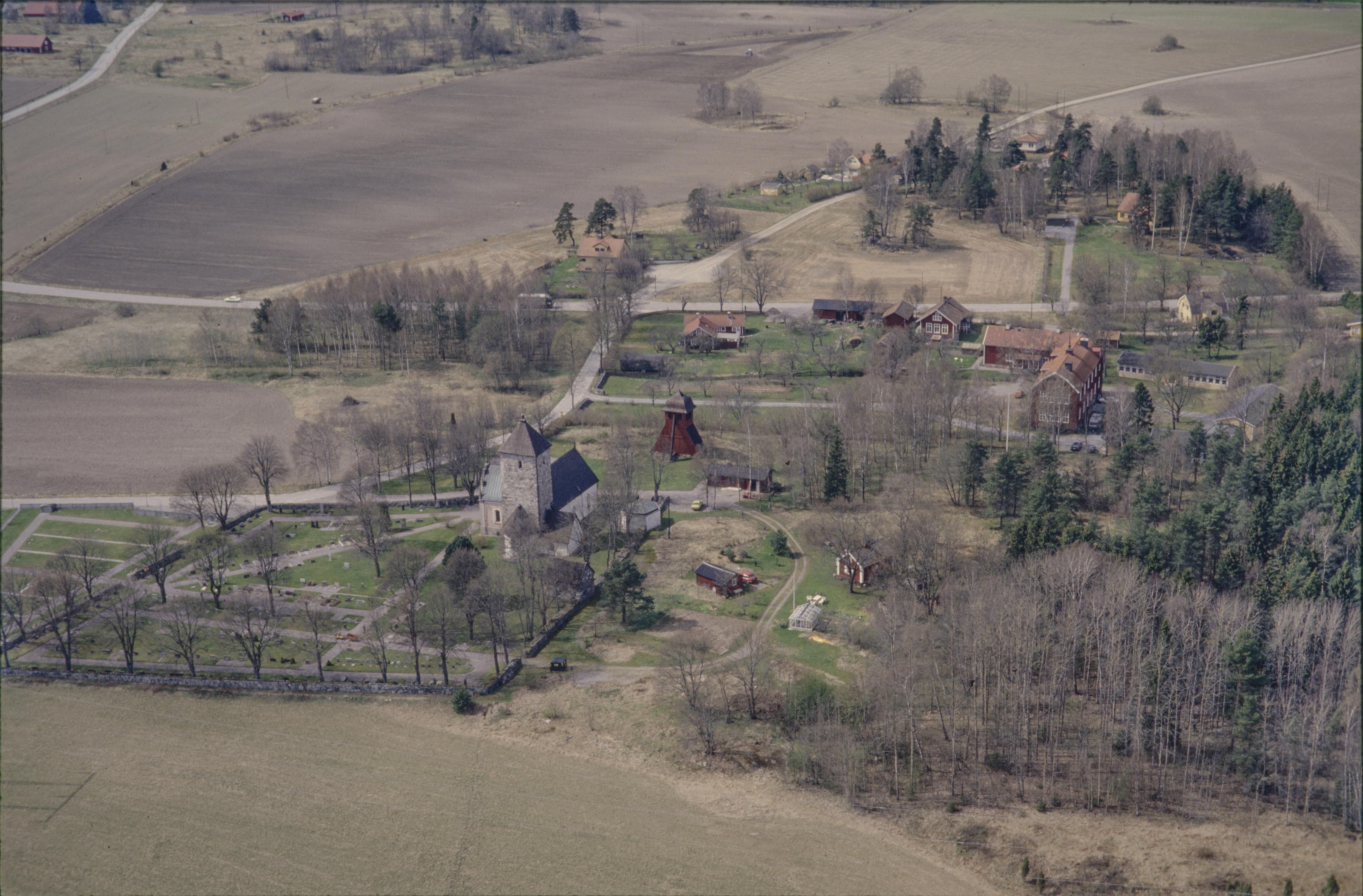 Beskrivning: Norrsunda kyrka och kyrkby. Uppe till höger gravfält RAÄnr Norrsunda 25:1. Bilden är tagen mot (väderstreck): VSV