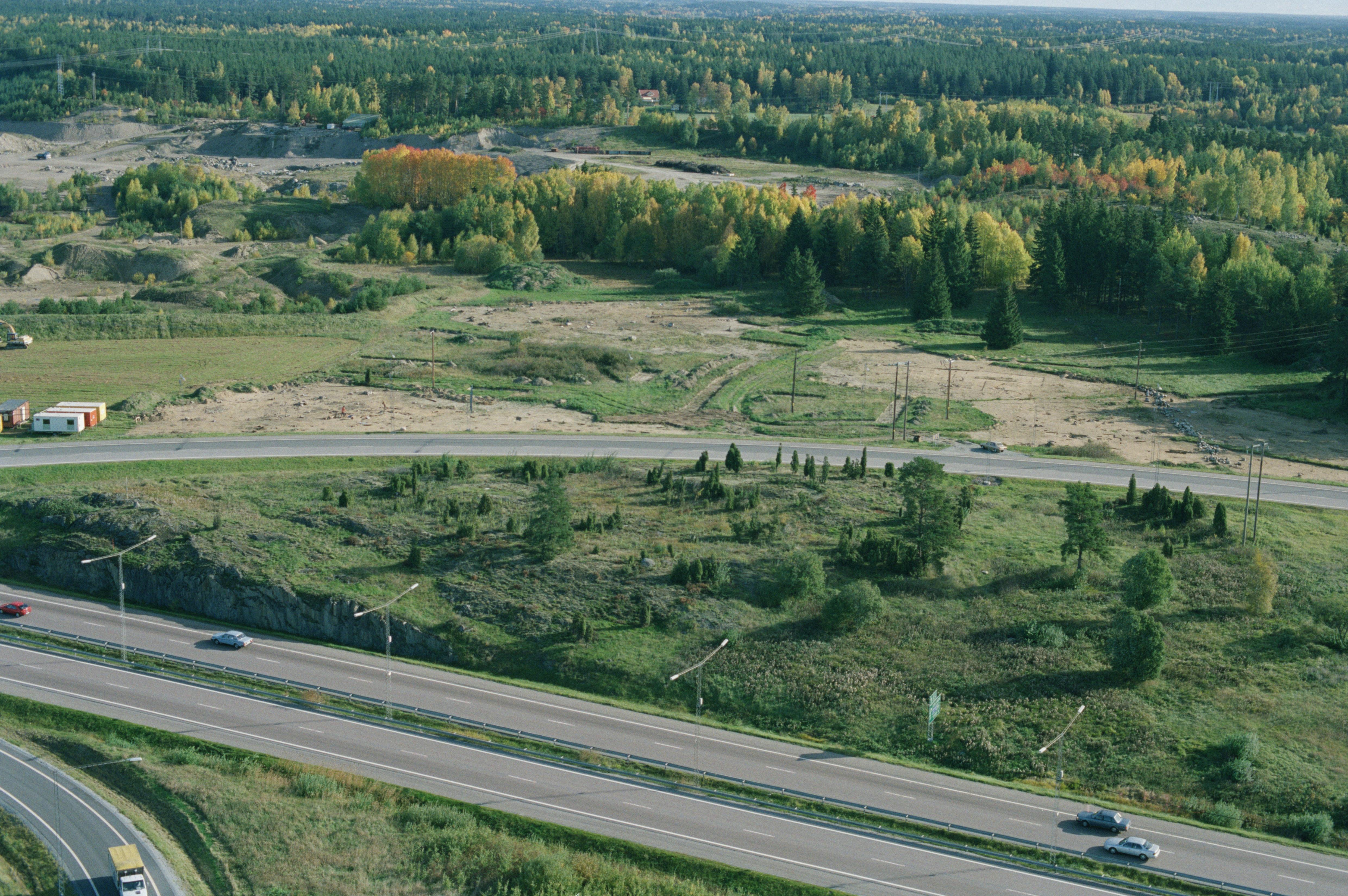 Beskrivning: Arkeologisk undersökning på östsidan av Norslunda golfbana och Märsta trafikplats, innan bygge av järnväg (Arlandabanan). Över bildens mitt gravfält RAÄnr Norrsunda 30:1, hägnad Norrsunda 93:1, 105:1 m.fl. Bilden är tagen mot (väderstreck): Ö