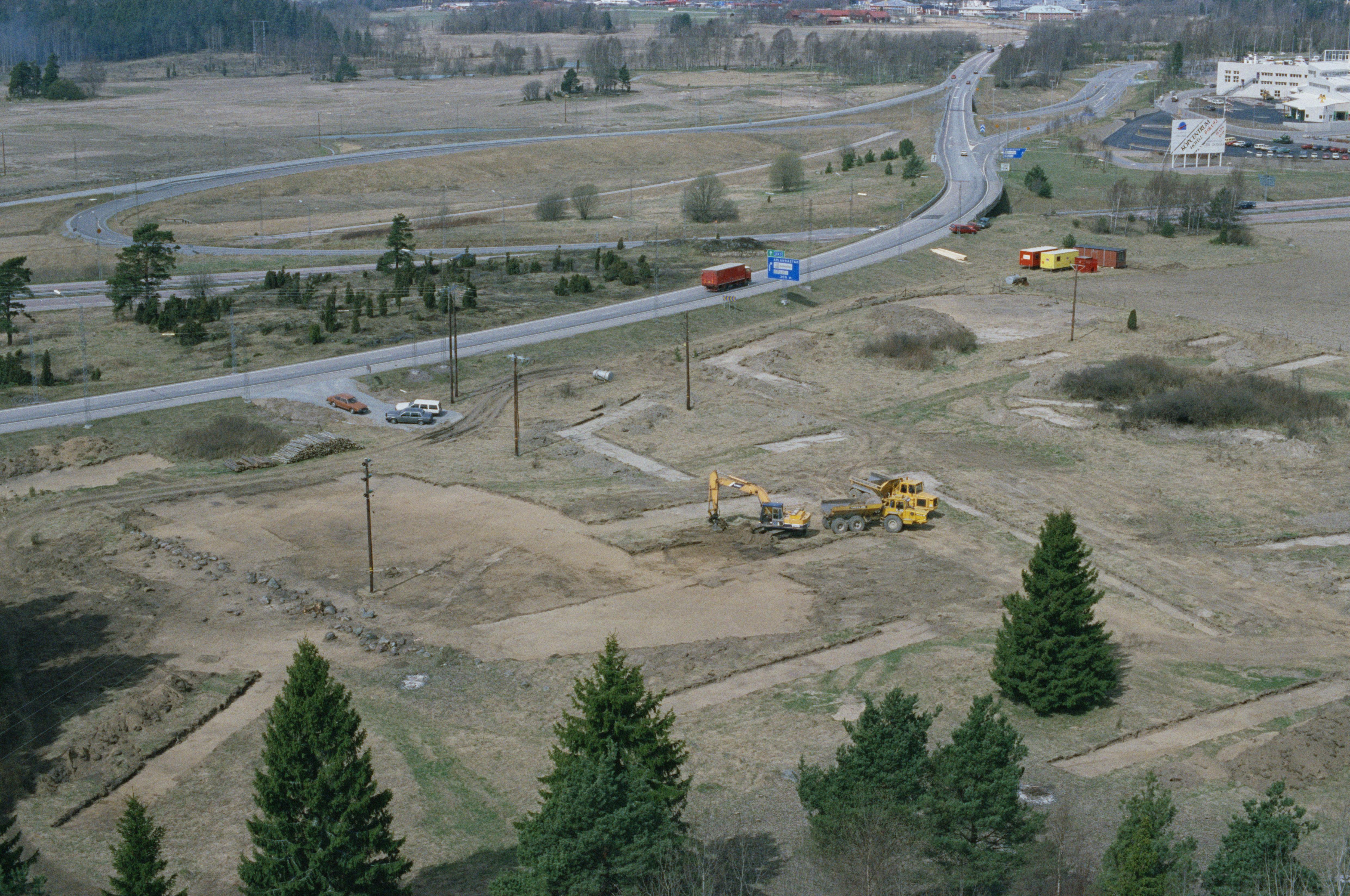 Beskrivning: Arkeologisk undersökning på östsidan av Norslunda golfbana och Märsta trafikplats, innan bygge av järnväg (Arlandabanan). I bildens nedre del boplats RAÄnr Norrsunda 185:1-2 och 186:1, färdväg Norrsunda 133:1, gravfält Norrsunda 30:1 m.fl. Bilden är tagen mot (väderstreck): NV