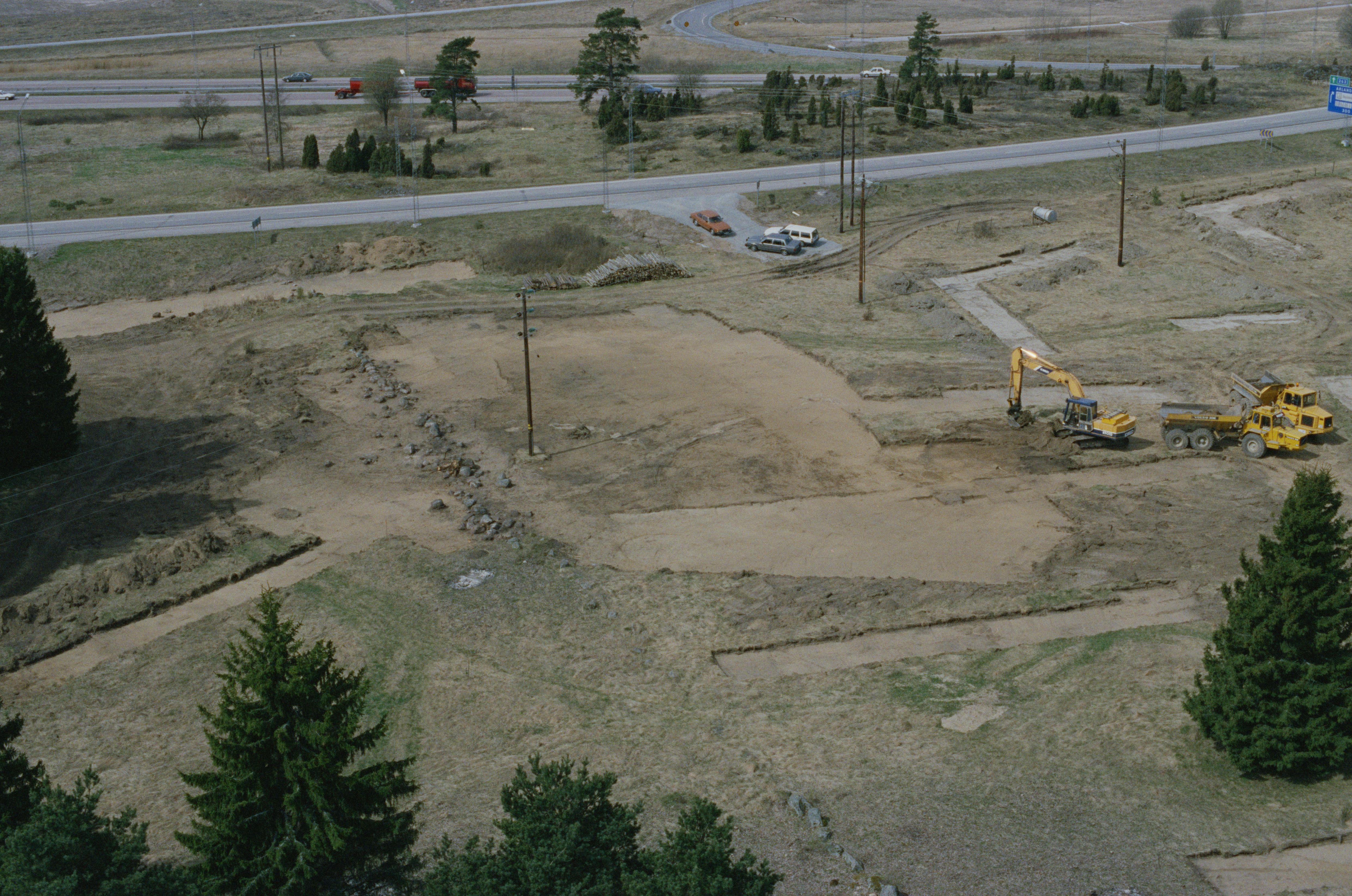 Beskrivning: Arkeologisk undersökning på östsidan av Norslunda golfbana och Märsta trafikplats, innan bygge av järnväg (Arlandabanan). I bildens nedre del boplats RAÄnr Norrsunda 185:1-2 och 186:1, färdväg Norrsunda 133:1, gravfält Norrsunda 30:1 m.fl. Bilden är tagen mot (väderstreck): VNV