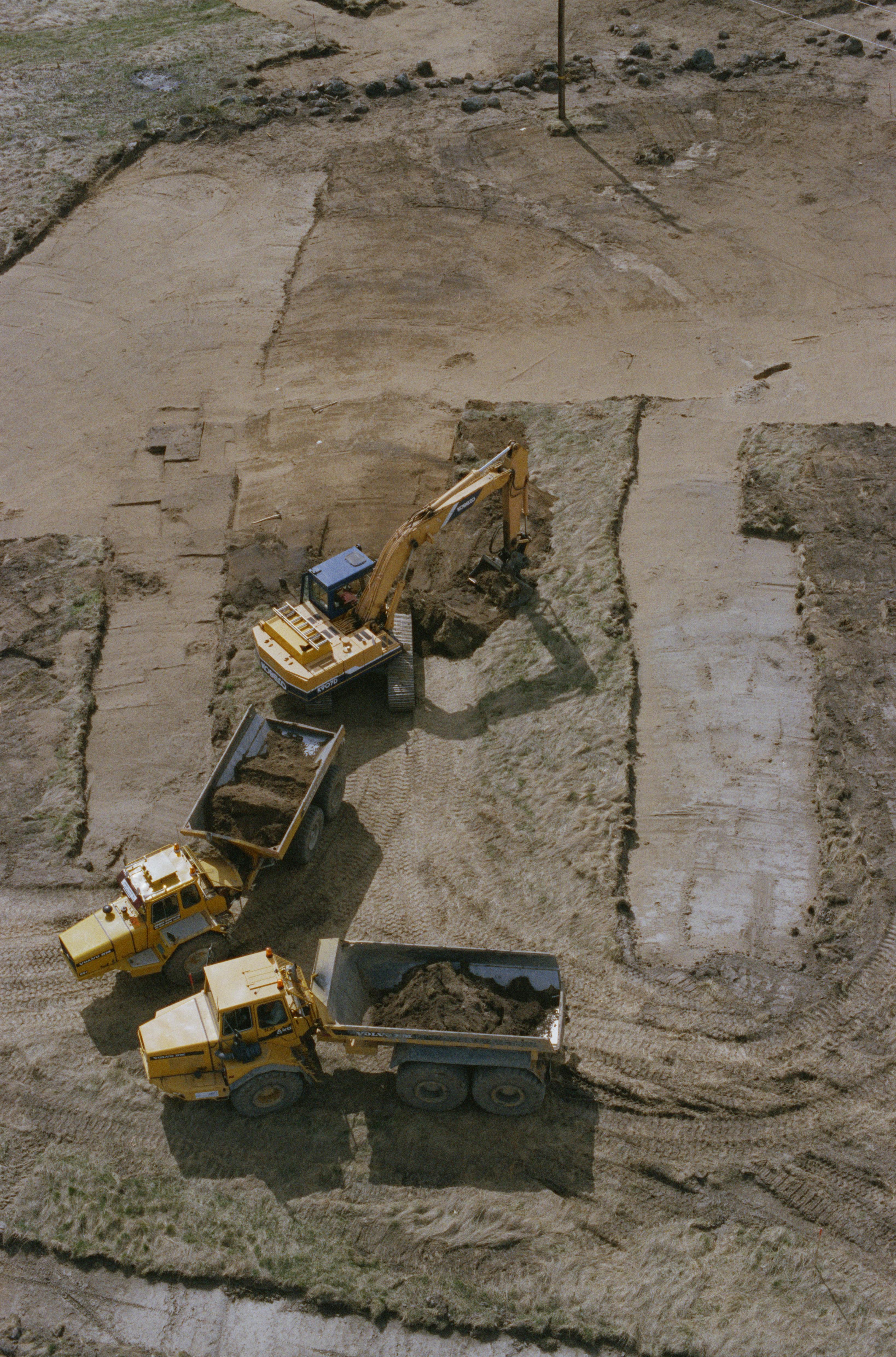 Beskrivning: Arkeologisk undersökning på östsidan av Norslunda golfbana och Märsta trafikplats, innan bygge av järnväg (Arlandabanan). Boplats RAÄnr Norrsunda 186:1. I bildens övre del hägnad Norrsunda 132:1 m.fl. Bilden är tagen mot (väderstreck): S