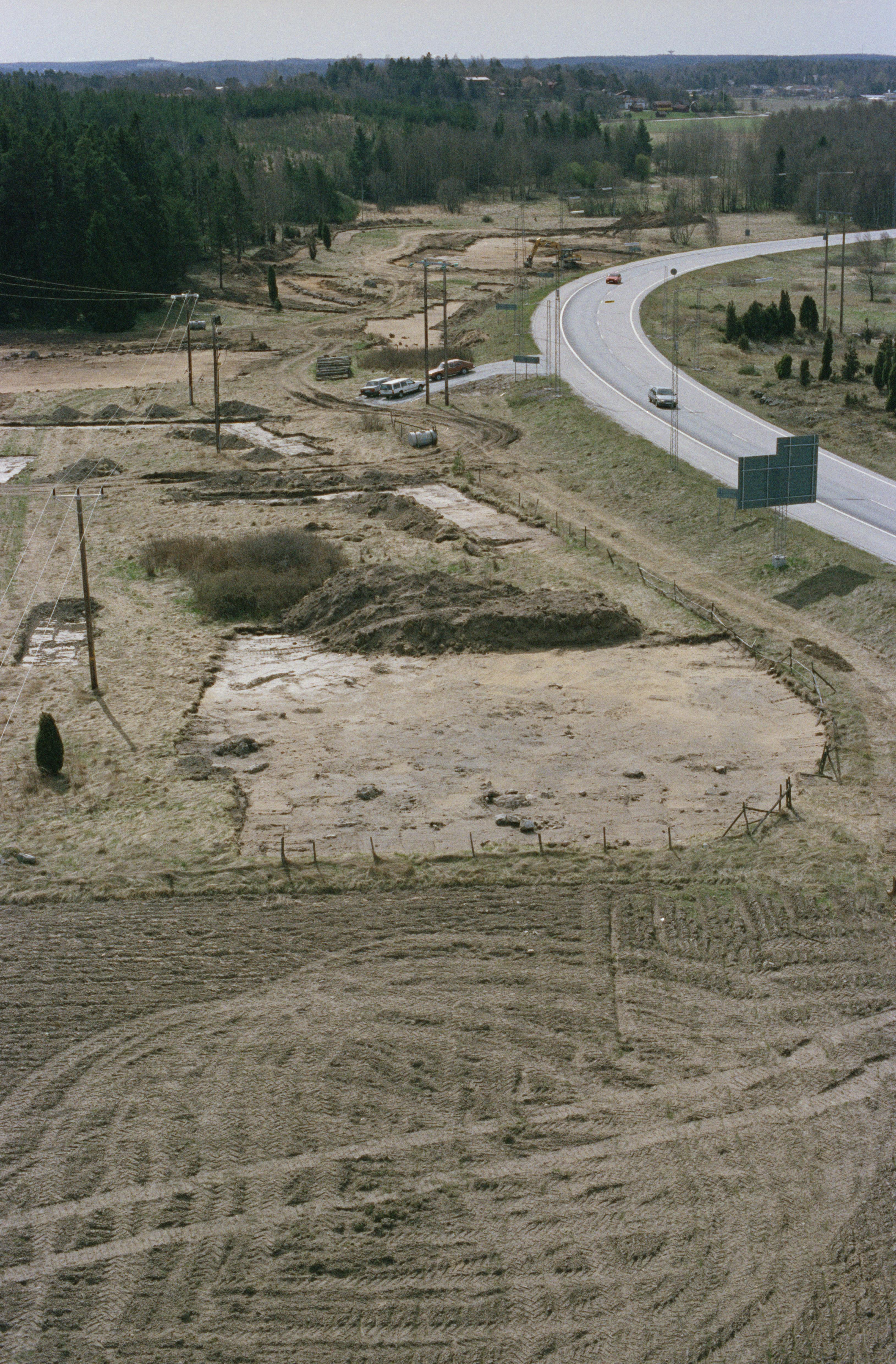 Beskrivning: Arkeologisk undersökning på östsidan av Norslunda golfbana och Märsta trafikplats, innan bygge av järnväg (Arlandabanan). Vid bildens mitt boplats RAÄnr Norrsunda 185:1-2 och 186:1. I bildens övre del hägnad Norrsunda 132:1 m.fl. Bilden är tagen mot (väderstreck): SSV