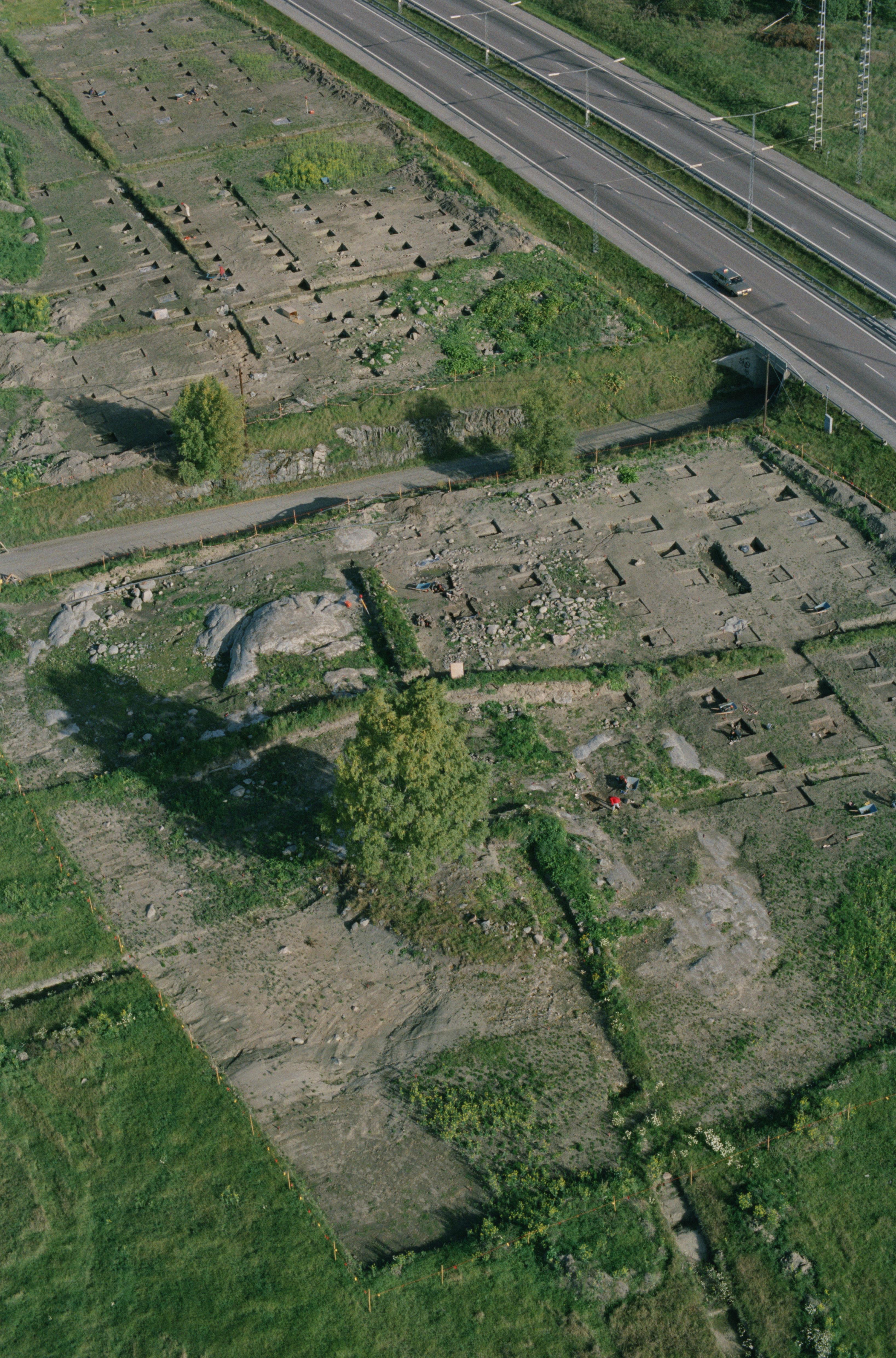 Beskrivning: Anmärkning (övrig): Riksintresse-nr/namn: AB71b - Skålhamravägen. Socken: delen i Skånela och Norrsunda socknar. Motivering: Centralbygd, herrgårdslandskap och vägsystem, med rötter i en forntida stormannabygd med anknytning till kungamakten. Landskapet speglar en rik och komplex järnåldersbygd och dess fortsatta utveckling genom den tidiga medeltidens sockenbildning och 1600-talets säterier, med kontinuitet fram i dagens agrarlandskap. (Fornlämningsmiljö). - Uttryck för riksintresset: Rika järnålderslämningar i form av bl.a. äldre vägsträckningar, många runristningar, flera i urprungligt läge, stensträngssystem och gravfält i anslutning till byar och gårdar. Uttryck för ett kungligt inflytande, som Nordians h(…) Texten i detta fält har förkortats vid migrering till e-arkivet. Se filbilagan extra.xml för fullständig information under note_archivist. Beskrivning: Östra delen av Rosersberg, väster om Ström. Arkeologisk undersökning av gravfält Norrsunda 52:1 innan bygge av järnväg (Arlandabanan). Bilden är tagen mot (väderstreck): NO Fotosyfte: Flygbildsdokumentation
