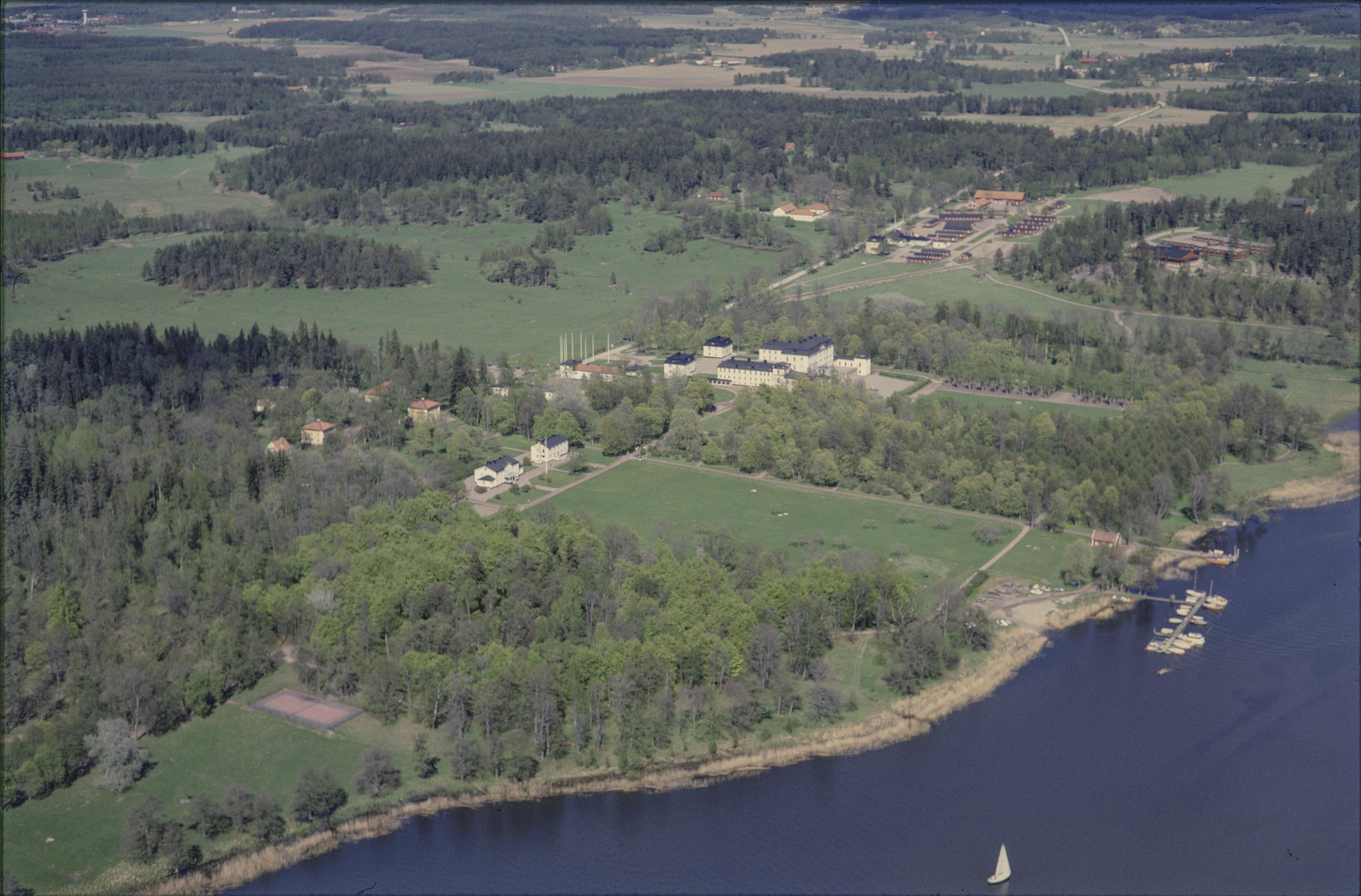 Beskrivning: Rosersbergs slott statligt byggnadsminne RAÄnr Norrsunda 77:1 vid Rosersbergsviken i Mälarens fjärd Skarven. Bilden är tagen mot (väderstreck): N